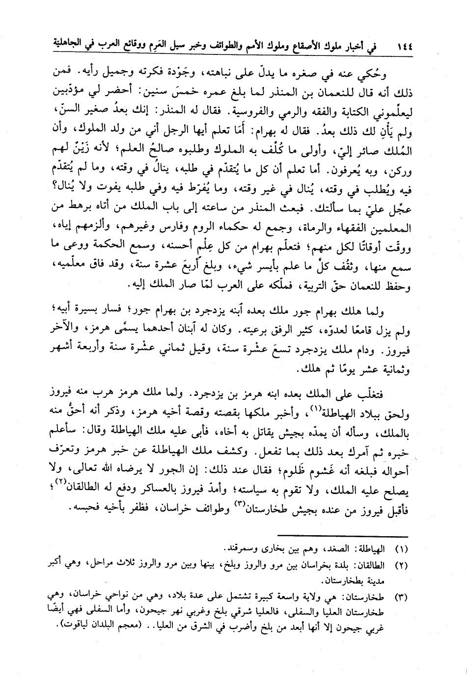 ولما هلك بهرام ملك بعده ابنه يزدجرد بن بهرام جور ؛ فسار بسيرة أبيه ؛ ولم يزل قامعاً لعدوه ، كثير الرفق برعيته . وكان له ابنان أحدهما يسمى هرمز ، والآخر فيروز . ودام ملك يزدجرد تسع عشرة سنة ، وقيل ثماني عشرة سنة وأربعة اشهر وثمانية عشر يوماً ثم هلك . فتغلب على الملك بعده ابنه هرمز بن يزدجرد . ولما ملك هرمز هرب منه فيروز ولحق ببلاد الهياطلة ، وأخبر ملكها بقصته وقصة أخيه هرمز ، وذكر أنه أحق منه بالملك ، وسأله أن يمده بجيش يقاتل به أخاه ، فأبى عليه ملك الهياطلة وقال : سأعلم خبره ثم آمرك بعد ذلك بما تفعل . وكشف ملك الهياطلة عن خبر هرمز وتعرف أحواله فبلغه أنه غشوم ظلوم ؛ فقال عند ذلك : إن الجور لا يرضاه الله تعالى ، ولا يصلح عليه الملك ، ولا تقوم به سياسته ؛ وأمد فيروز بالعساكر ودفع له الطالقان ؛ فأقبل فيروز من عنده بجيش طخارستان وطوائف خراسان ، فظفر بأخيه فحبسه .