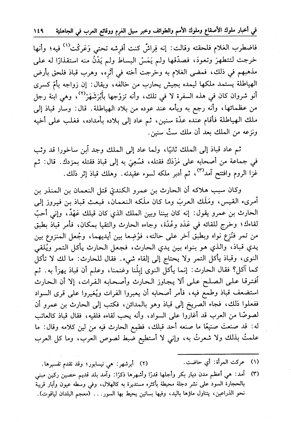ثم عاد قباذ إلى الملك ثانياً ، ولما عاد إلى الملك وجد ابن ساخورا قد وثب في جماعة من أصحابه على مزدك فقتله ، فسعى به إلى قباذ فقتله بمزدك . قال : ثم غزا الروم وافتتح آمد ، ثم أدبر ملكه لسوء عقيدته . وهلك قباذ إثر ذلك . وكان سبب هلاكه أن الحارث بن عمرو الكندي قتل النعمان بن المنذر ابن امرئ القيس ، وملك العرب وما كان ملكه النعمان ، فبعث قباذ بن فيروز إلى الحارث بن عمرو يقول : إنه كان بيننا وبين الملك الذي كان قبلك عهد ، وإني أحب لقاءك ، وخرج للقائه في عدد وعدة ، وجاءه الحارث والتقيا بمكان ، فأمر قباذ بطبق من تمر فنزع نواه وبطبق آخر على حالته ، فوضعا بين أيديهما ، وجعل المنزوع بين يدي قباذ ، والذي هو بنواه بين يدي الحارث ، فجعل الحارث يأكل التمر ويلقي النوى ، وقباذ يأكل التمر ولا يحتاج إلى غلقاء شيء . فقال للحارث : مالك لا تأكل كما آكل ؟ فقال الحارث : غنما يأكل النوى إبلنا وغنمنا ، وعلم أن قباذ يهزأ به . ثم افترقا على الصلح على ألا يجاوز الحارث وأصحابه الفرات ، إلا أن الحارث استضعف قباذ وطمع فيه . فأمر أصحابه أن يعبروا الفرات ويغيروا على قرى السواد ففعلوا ذلك ، فجاء الصريخ إلى قباذ وهو بالمدائن ، فكتب إلى الحارث بن عمرو أن لصوصاً من العرب قد أغاروا على السواد ، وأنه يحب لقاءه فلقيه ، فقال قباذ كالعاتب له : قد صنعت صنيعاً ما صنعه أحد قبلك ، فطمع الحارث فيه من لين كلامه وقال : ما علمت بذلك ولا شعرت به ، وإني لا أستطيع ضبط لصوص العرب ، وما كل العرب
