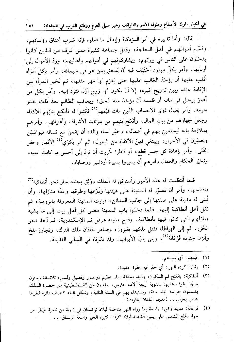 وأمر بكل من أضر برجل في ماله أو ظلمه أن يؤخذ منه الحق ، ويعاقب الظالم بقدر جرمه . وأمر بعيال ذوي الأحساب الذين مات قيمهم فكتبوا له فأنكح بناتهم للأكفاء وجعل جهازهم من بيت المال ، وأنكح بينهم من بيوتات الأشراف وأغنيائهم . وأمرهم بملازمة بابه لستعين بهم في أعماله ، وخير نساء والده أن يقمن مع نسائه فيواسين ويصيرن في الأحرار ، ويبتغي لهن الأكفاء من البعول ، ثم أمر بكرى الأنهار وحفر القنى . وأمر بإعادة كل جسر قطع ، أو قنطرة خربت أن ترد إلى أحسن ما كانت عليه ، وتخير الحكام والعمال وأمرهم أن يسيروا بسيرة أردشير ووصاياه . فلما انتظمت له هذه الأمور واستوثق له الملك ووثق بجنده سار نحو أنطاكية فافتتحها ، وأمر أن تصور له المدينة على هيئتها وذرعها وطرقها وعدة منازلها ، وأن تبنى له مدينة على صفتها إلى جانب المدائن ، فبنيت المدينة المعروفة بالرومية ، ثم نقل أهل أنطاكية إليها . فلما دخلوا باب المدينة مضى كل أهل بيت إلى ما يشبه منازلهم التي كانوا فيها بأنطاكية . وفتح مدينة هرقل ثم الإسكندرية ، ثم أخذوا نحو الخزر ، ثم إلى الهياطلة فقتل ملكهم بفيروز ، وصاهر خاقان ملك الترك ، وتجاوز بلخ وأنزل جنوده فرغانة ، وبنى باب الأبواب . وقد ذكرناه في المباني القديمة .