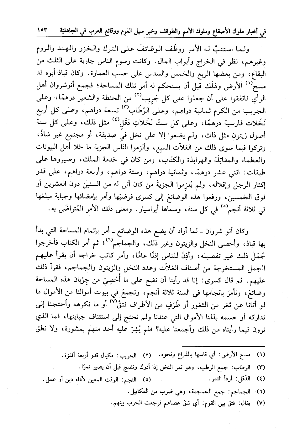 ولما استتب له الأمر ووظف الوظائف على الترك والخزر والهند الروم غيرهم ، نظر في الخراج وأبواب المال . وكانت رسوم الناس جارية على الثلث من البقاع ، ومن بعضها الربع والخمس والسدس على حسب العمارة . وكان قباذ أبوه قد مسح الأرض وهلك قبل أن يستحكم له أمر تلك المساحة ؛ فجمع أنوشروان أهل الرأي فاتفقوا على أن جعلوا على كل جريب من الحنطة والشعير درهماً ، وعلى الجريب من الكرم ثمانية دراهم ، وعلى الرطاب تسعة دراهم ، وعلى كل أربع نخلات فارسية درهماً ، وعلى كل ست نخلات دقل مثل ذلك ، وعلى كل ستة أصول زستون مثل ذلك ، ولم يضعوا إلا على نخل في حديقة ، أو مجتمع غير شاذ ، وتركوا فيما سوى ذلك من الغلات السبع ، وألزموا الناس الجزية ما خلا أهل البيوتات والعظماء والمقاتلة والهرابذة والكتاب ، ومن كان في خدمة املك ، وصيروها على طبقات : اثني عشر درهماً ، وثمانية دراهم ، وستة دراهم ، وأربعة دراهم ، على قدر إكثار الرجل وإقلاقه ، ولم يلزموا الجزية من كان أتى له من السنين دون العشرين أو فوق الخمسين ، ورفعوا هذه الوضائع إلى كسرى فرضيها وأمر بإمضائها وجباية مبلغها في ثلاثة أنجم في كل سنة ، وسماها ابراسيار . ومعنى ذلك الأمر المتراضي به . وكان أنوشروان - لما أراد أن يضع هذه الوضائع - أمر بإتمام المساحة التي بدا بها قباذ ، وأحصى النخل والزيتون وغير ذلك ، والجماجم ؛ ثم أمر الكتاب فأخرجوا جمل ذلك غير تفصيله ، وأذن للناس إذناً عاماً ، وأمر كاتب خراجه أن يقرأ عليهم الجمل المستخرجة من أصناف الغلات وعدد النخل والزيتون والجماجم ، فقرأ ذلك عليهم . ثم قال كسرى : إنا قد رأينا أن نضع على ما أحصى من جربان هذه المساحة وضائع ، فأمر بإنجامها في السنة ثلاثة أنجم ، ونجمع في بيوت أموالنا من الأموال ما لو أتانا عن ثغر من الثغور أو طرف من الأطراف فتق أو ما نكرهه واحتجنا إلى تداركه أو حسمه بذلنا الأموال التي عندنا ولم نحتج إلى استئناف جبايتها ، فما الذي ترون فيما رأيناه من ذلك وأجمعنا عليه ؟ فلم يشر عليه أحد منهم بمشورة ،