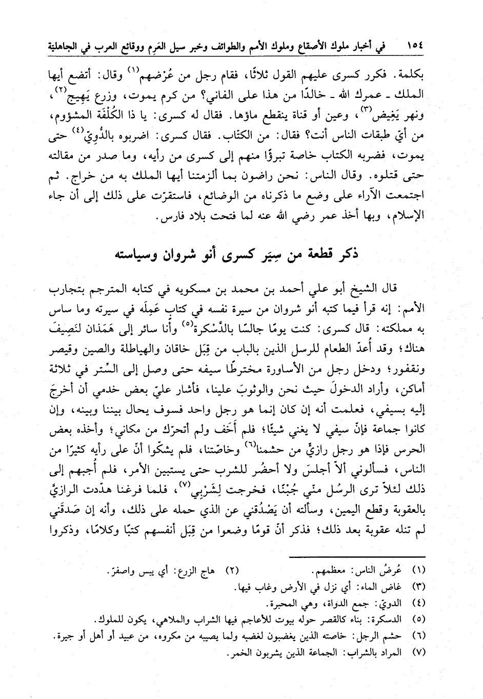 ولا نطق بكلمة . فكرر كسرى عليهم القول ثلاثاً ، فقام رجل من عرضهم وقال : أتضع أيها الملك - عمرك الله - خالداً من هذا على الفاني ؟ من كرم يموت ، وزرع يهيج ، ونهر يغيض ، وعين أو قناة ينقطع ماؤها . فقال له كسرى : يا ذا الكلفة المشئوم ، من أي طبقات الناس أنت ؟ فقال : من الكتاب . فقال كسرى : اضربوه بالدوي ، حتى يموت ، فضربه الكتاب خاصة تبرؤا منهم إلى كسرى من رأيه ، وما صدر من مقالته حتى قتلوه . وقال الناس : نحن راضون بما الزمتنا أيها الملك يه من خراج . ثم اجتمعت الآراء على وضع ما ذكرناه من الوضائع ، فاستقرت على ذلك إلى أن الإسلام ، وبها أخذ عمر رضي الله عنه لما فتحت بلاد فارس .