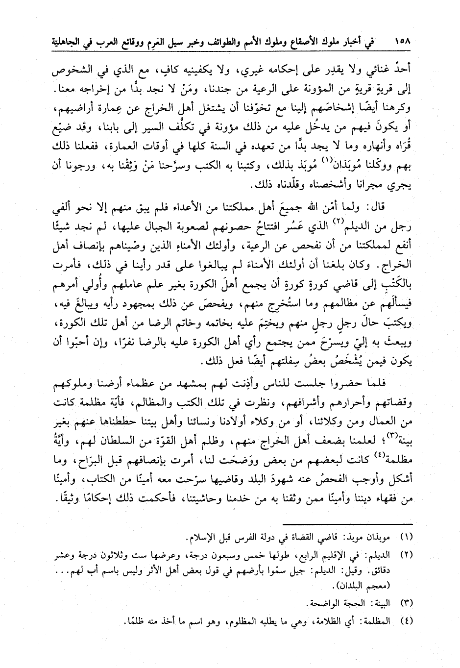 أحد غنائي ولا يقدر على إحكامه غيري ، ولا يكفينيه كاف ، مع الذي في الشخوص إلى قرية قرية من المئونة على الرعية من جندنا ، ومن لا نجد بداً من إخراجه معنا . وكرهنا أيضاً إشخاصهم إلينا مع تخوفنا أن يشتغل أهل الخراج عن عمارة أراضيهم ، أو يكون فيهم من يدخل عليه من ذلك مئونة في تكلف السير إلى بابنا ، وقد ضيع قراه وأنهاره وما لا يجد بداً من تعهده في السنة كلها في أوقات العمارة ، ففعلنا ذلك بهم ووكلنا موبذان موبذ بذلك ، وكتبنا به الكتب وسرحنا من وثقنا به ، ورجونا أن يجري مجرانا وأشخصناه وقلدناه ذلك .