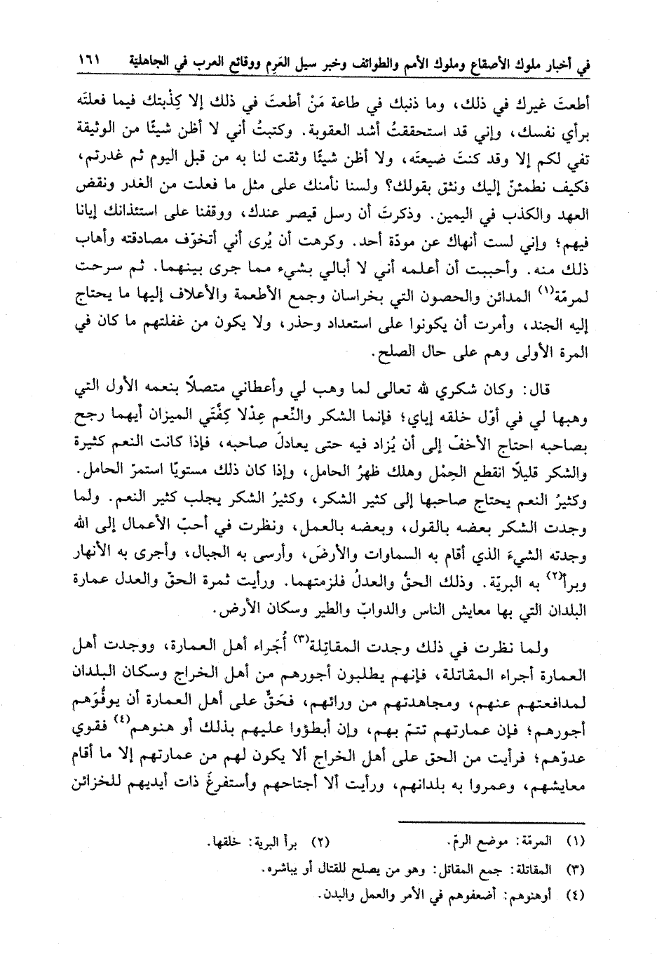 ولما نظرت في ذلك وجدت المقاتلة أجراء أهل العمارة ، ووجدت أهل العمارة أجراء المقاتلة ، فإنهم يطلبون أجورهم من أهل الخراج وسكان البلدان لمدافعتهم عنهم ، ومجاهدتهم من ورائهم ، فحق على أهل العمارة أن يوفوهم أجورهم ؛ فإن عمارتهم تتم بهم ، وإن أبطأوا عليهم بذلك أو هدوهم فقوي عدوهم ؛ فرأيت من الحق على أهل الخراج ألا يكون لهم من عمارتهم إلا ما أقام معايشهم ، وعمروا به بلدانهم ، ورأيت ألا أجتاحهم وأستفرغ ذات أيديهم للخزائن