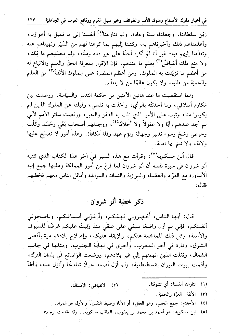 ولما استقصيت ما عند هاتين الأمتين من حكمة التدبير والسياسة ، ووصلت بين مكارم أسلافي ، وما أحدثته بالرأي ، وأخذت به نفسي ، وقبلته عن الملوك الذين لم يكونوا منا ، وثبت على الأمر الذي نلت به الظفر والخير ، ورفضت سائر الأمم لأني لم أجد عندهم رأياً ولا عقولاً ولا أحلاماً ، ووجدتهم أصحاب بغي وحسد وكلب وحرص وشح وسوء تدبير وجهالة ولؤم عهد وقلة مكافأة . وهذه أمور لا تصلح عليها ولاية ، ولا تتم لها نعمة .