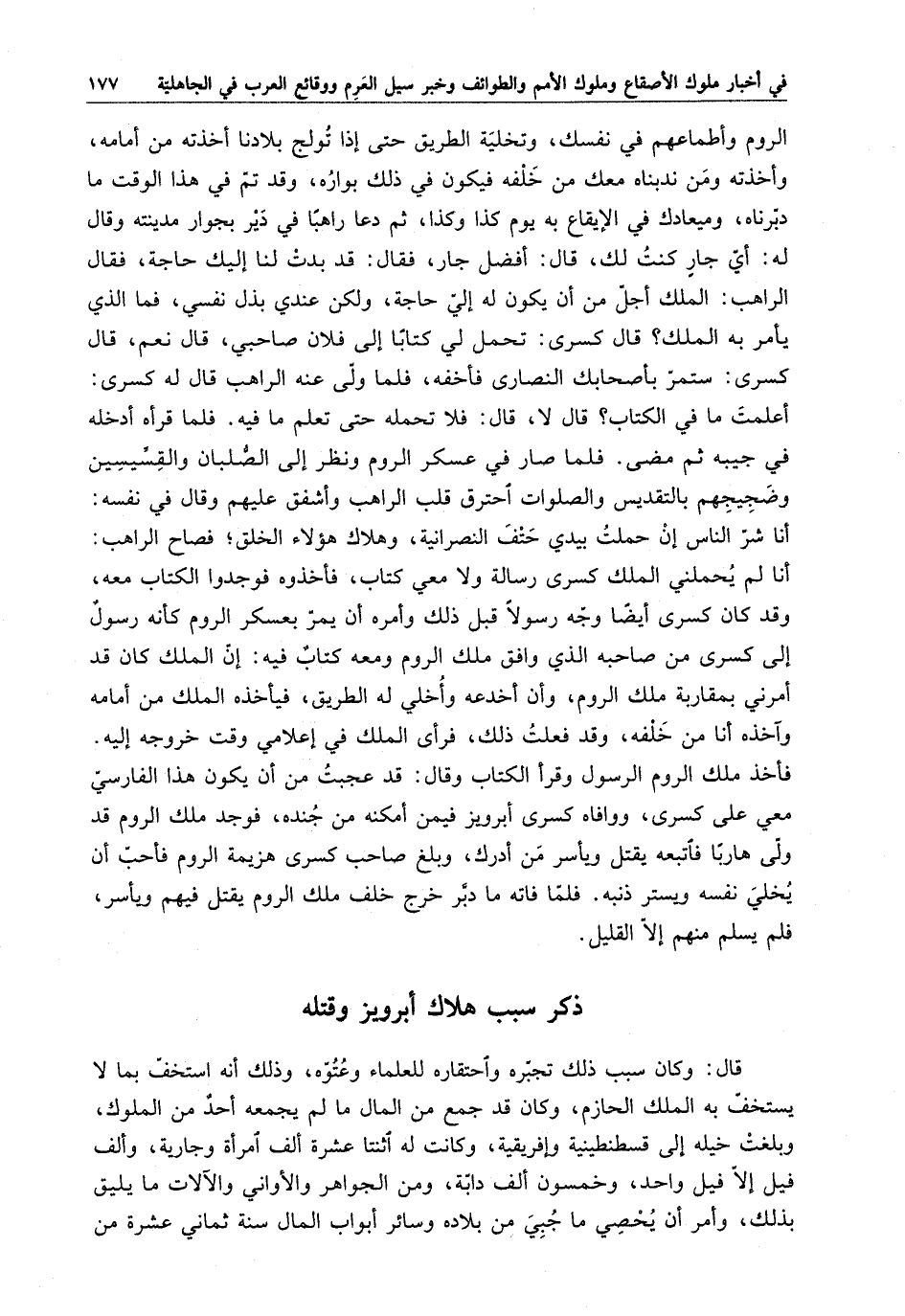 الروم وأطماعهم في نفسك ، وتخلية الطريق حتى إذا تولج بلادنا أخذته من أمامه ، وأخذته ومن ندبناه معك من خلفه فيكون في ذلك بواره ، وقد تم في هذا الوقت ما دبرناه ، وميعادك في الإيقاع به يوم كذا وكذا ، ثم دعا راهباً في دير بجوار مدينته وقال له : أي جار كنت لك ، قال : أفضل جار ، فقال : قد بدت لنا إليك حاجة ، فقال الراهب : الملك أجل من أن يكون له إلي حاجة ، ولكن عندي بذل نفسي ، فما يأمر به الملك ؟ قال كسرى : تحمل لي كتاباً إلى فلان صاحبي ، قال نعم ، قال كسرى : ستمر بأصحابك النصارى فأخفه ، فلما ولى عنه الراهب قال له كسرى : أعلمت ما في الكتاب ؟ قال لا : قال : فلا تحمله حتى تعلم ما فيه . فلما قرأه أدخله في جيبه ثم مضى . فلما صار في عسكر الروم ونظر إلى الصلبان والقسيسين وضجيجهم بالتقديس والصوات احترق قلب الراهب وأشفق عليهم وقال في نفسه : أنا شر الناس إن حملت بيدي حتف النصرانية ، وهلاك هؤلاء الخلق ؛ فصاح الراهب : أنا لم يحملني الملك كسرى رسالة ولا معي كتاب ، فأخذوه فودجوا الكتاب معه ، وقد كان كسرى أيضاً وجه رسولاً قبل ذلك وأمره أن يمر بعسكر الروم كأنه رسول إلى كسرى من صاحبه الذي وافق ملك الروم ومعه كتاب فيه : إن الملك كان قد أمرني بمقاربة ملك الروم ، وأن أخدعه وأخلي له الطريق ، فيأخذه الملك من أمامه وآخذه أنا من خلفه ، وقد فعلت ذلك ، فرأى الملك في إعلامي وقت خروجه إليه . فأخذ ملك الروم الرسول وقرأ الكتاب وقال : قد عجبت من أن يكون هذا الفارسي معي على كسرى ، ووافاه ويأسر من أدرك ، وبلغ صاحب كسرى هزيمة الروم فأحب أن يخلي نفسه ويستر ذنبه . فلما قاته ما دبر خرج ملك الروم يقتل فيهم ويأسر ، فلم يسلم منهم إلا القليل .