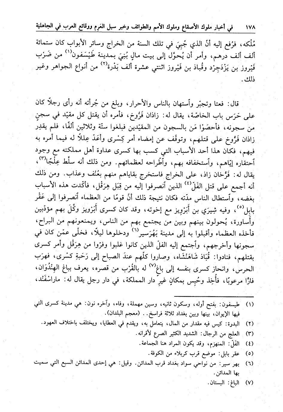 ملكه ، فرفع إليه أن الذي جبى في تلك السنة من الخراج وسائر الأبواب كان ستمائة ألف ألف درهم ، وأمر أن يحول إلى بيت مال بني بمدينة طيسفون من ضرب فيروز بن يزدجرد وقباذ بن فيروز اثنتي عشرة ألف بدرة من أنواه الجواهر وغير ذلك . قال : فعتا وتجبر واستهان بالأنس والأحرار ، وبلغ من جرأته أنه رأى رجلاً كان على حرس باب الخاصة ، يقال له : زاذان فروخ ، فأمره أن يقتل كل مقيد في سجن من سجونه ، فأحصوا من بالسجون من المقيدين فبلغوا ستة وثلاثين ألفاً ، فلم يقدر زاذان فروخ على قتلهم ، وتوقف عن إمضاء أمر كسرى وأعد عللاً له فيما أمره به فيهم ، فكان هذا أحذ الأسباب التي كسب بها كسرى عماوة أهل مملكته مع وجود احتقاره إياهم ، واستخفافه بهم ، واطراحه لعظمائهم .