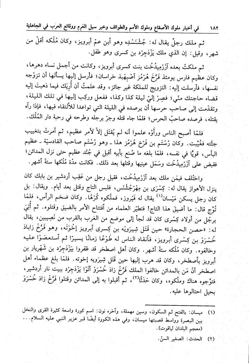 واختلف فيمن ملك بعد آزرميد ، فقيل رجل من عقب أردشير بن بابك كان ينزل الأهواز يقال له : كسرى بن مهرجشنس ، فلبس التاج وقتل بعد أيام . ويقال : بل كان رجل يسكن ميسان يقال له فيروز ، فملكوه كرهاً . وكان ضخم الرأس ، فلما توج قال : ما أضيق هذا التاج فتطير العلماء من افتتاح الأمر بالضيق وقتلوه . ثم أتى برجل من أولاد كسرى كان قد لجأ إلى موضع من الغرب بالقرب من نصيبين ، يقال له حصن الحجارة حين قتل شيرويه بن كسرى أبرويز إخوته ، وهو فرخ زاباذ خسرو بن كسرى أبرويز ، فانقاد الناس له طوعاً زماناً يسيراً ثم استعصوا عليه وخالفوه . وكان ملكه ستة أشهر ، وكان أهل اصطخر قد ظفروا بيزدجرد بن شهريار بن أبرويز باصطخر ، وكان قد هرب إليها حين قتل شيرويه إخوته . فما بلغ عظماء أهل اصطخر أن من بالمدائن خالفوا الملك فرخ زاذ خسرو أتوا يزدجرد ببيت نار أردشير ، فتوجوه هناك وملكوه ، وكان حدثاً ثم أقبلوا به إلى المدائن وقتلوا فرخ زاذ خسرو بحيل احتالوها عليه .
