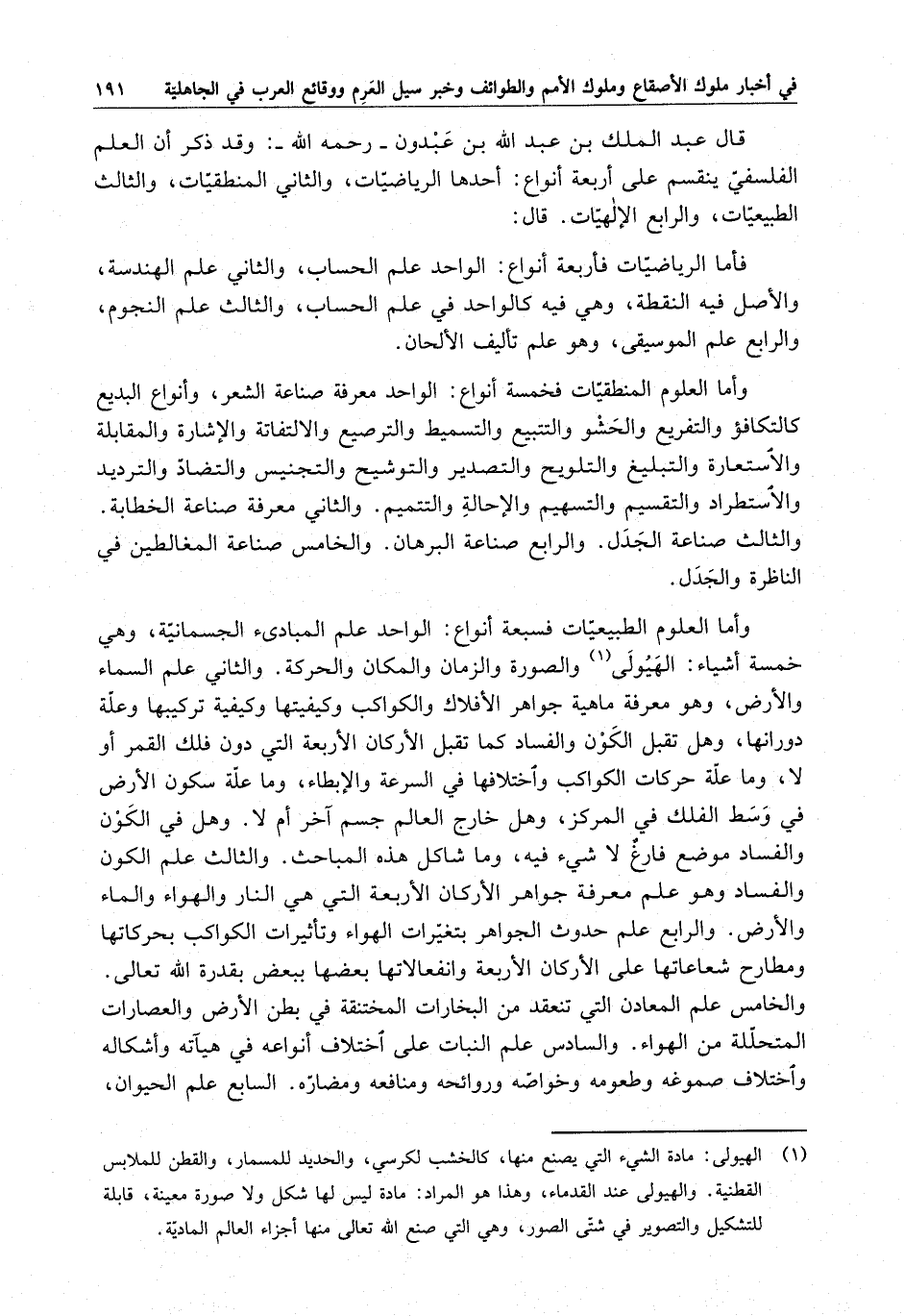 وأما العلوم الطبيعيات فسبعة أنواع : الواحد علم المبادئ الجسمانية ، وهي خمسة أشياء : الهيولى والصورة والزمان والمكان والحركة . والثاني علم السماء والأرض ، وهو معرفة ماهية جواهر الأفلاك والكواكب وكيفيتها وكيفية تركيبها وعلة دورانها ، وهل تقبل الكون كما تقبل الأركان الأربعة التي دون فلك القمر أو لا ، وما علة حركات الكواكب واختلافها في السرعة والإبطاء ، وما علة سكون الأرض في وسط الفلك في المركز ، وهل خارج العالم جسم آخر أم لا . وهل في الكون والفساد موضع لاشيء فيه ، وما شاكل هذه المباحث . والثالث علم الكون والفساد وهو علم معرفة جواهر الأركان الأربعة التي هي النار والهواء والماء والأرض . والرابع علم حدوث الجواهر بتغيرات الهواء وتأثيرات الكواكب بحركاتها ومطارح شعاعاتها على الأركان الأربعة وانفعالاتها بعضها ببعض بقدرة الله تعالى . والخامس علم المعادن التي تنعقد من البخارات المختنقة في بطن الأرض والعصارات المتحللة من الهواء . والسادس علم النبات على اختلاف أنواعه في هيآته وأشكاله واختلاف صموغه وطعومه وخواصه وروائحه ومنافعه ومضاره . السابع علم الحيوان ،