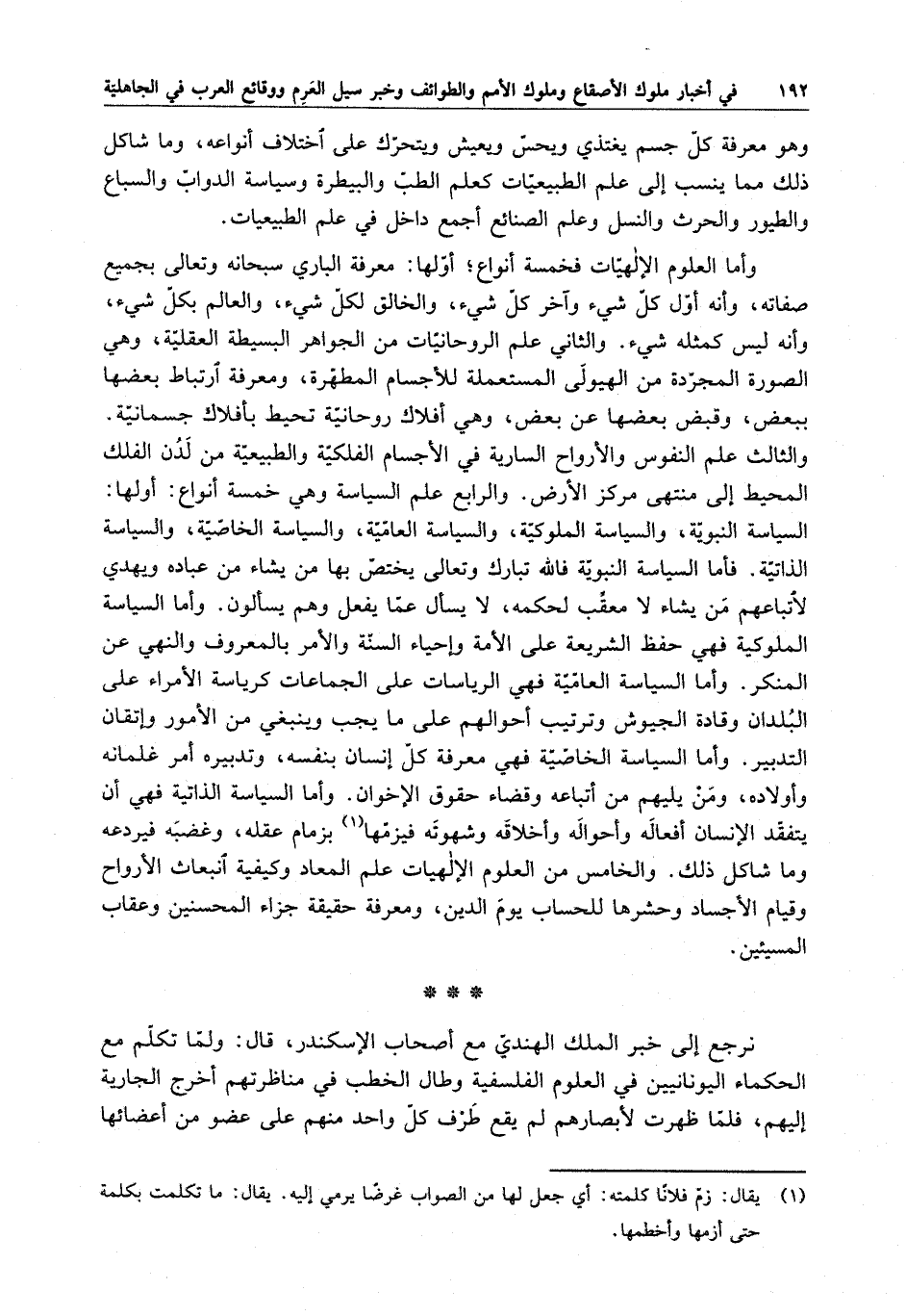 وأما العلوم الإلهيات فخمسة أنواع ؛ أولها : معرفة الباري سبحانه وتعالى بجميع صفاته ، وأنه أول كل شيء ، والخالق لكل شيء ، والعالم بكل شيء ، وأنه ليس كمثله شيء . والثاني علم الروحانيات من الجواهر البسيطة العقلية ، وهي الصورة المجردة من الهيولى المستعملة للأجسام المطهرة ، ومعرفة ارتباط بعضها ببعض ، وقبض بعضها عن بعض ، وهي أفلاك روحانية تحيط بأفلاك جسمانية . والثالث علم النفوس والأرواح السارية ي الأجسام الفلكية والطبيعية من لدن الفلك المحيط إلى منتهى مركز الأرض . والرابع علم السياسة العامية والسياسة الخاصية والسياسة الذاتية . فأما السياسة النبوية فالله تبارك وتعالى يختص بها من يشاء من عباده ويهدي لأتباعهم من يشاء لا معقب لحكمه ، لا يسال عما يفعل وهم يسألون . وأما السياسة الملوكية فهي حفظ الشريعة على الأمة وإحياء السنة والأمر بالمعروف والنهي عن المنكر . وأما السياسة العامية فهي الرياسات على الجماعات كرياسة الأمراء على البلدان وقادة الجيوش وترتيب أحوالهم على ما يجب وينبغي من الأمور وإتقان التدبير . وأما السياسة الخاصية فهي معرفة كل إنسان بنفسه ، وتدبيره أمر غلمانه وأولاده ، ومن يليهم من أتباعه وقضاء حقوق الإخوان . وأما السياسة الذاتية فهي أن يتفقد الإنسان أفعاله وأحواله وأخلاقه وشهوته فيزمها بزمام عقله ، وغضبه فيردعه وما شاكل ذلك . والخامس من العلوم الإلهيات علم المعاد وكيفية انبعاث الأرواح وقيام الأجسام وحشرها للحساب يوم الدين ، ومعرفة حقيقة جزاء المحسنين وعقاب المسيئين .