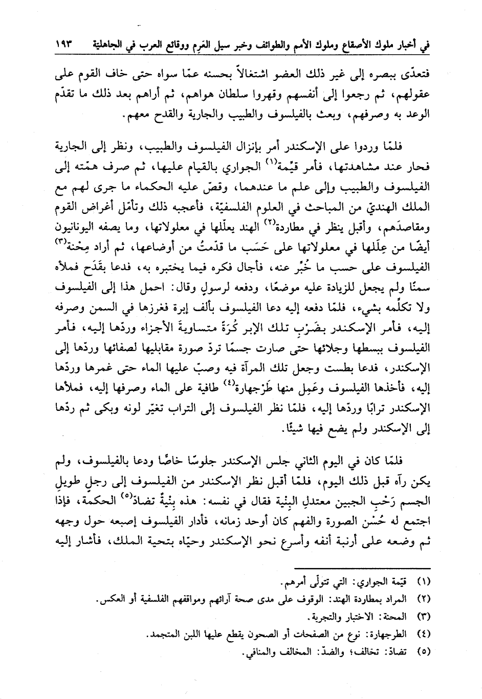 فلما وردوا على الإسكندر أمر بإنزال الفيلسوف والطبيب ، ونظر إلى الجارية فحار عند مشاهدتها ، فأمر قيمة الجواري بالقيام عليها ، ثم صرف همته إلى الفيلسوف والطبيب وإلى علم ما عندهما ، وقص عليه الحكماء ما جرى لهم مع الملك الهندي من المباحث في العلوم الفلسفية ، فأعجبه ذلك وتأمل أغراض القوم ومقاصدهم ، وأقبل ينظر في مطاردة الهند يعللها في معلولاتها ، وما يصفه اليونانيون أيضاً من عللها في معلولاتها على حسب ما قدمت من أوضاعها ، ثم أراد محنة الفيلسوف على حسب ما خبر عنه ، فأجال فيما يختبره به ، فدعا بقدح فملاه سمناً ولم يجعل للزيادة عليه موضعاً ، ورفعه لرسول وقال : احمل هذا إلى الفيلسوف ولا تكلمه بشيء ، فلما دفعه إليه دعا الفيلسوف بألف إبرة فغرزها في السمن وصرفه إليه ، فأمر الإسكندر بضرب تلك الإبر كرة متساوية الأجزاء وردها إليه ، فأمر الفيلسوف ببسطها وجلائها حتى صارت جسماً ترد صورة مقابليها لصفائها وردها إلى الإسكندر ، فدعا بطست وجعل تلك المرآة فيه وصب عليها الماء حتى غمرها وردها إليه ، فأخذها الفيلسوف وعمل منها طرجهالة طافية على إملاء وصرفها إليه ، فملأها الإسكندر وردها غليه ، فلما نظر الفيلسوف إلى التراب تغير لونه وبكى ثم ردها إلى الإسكندر ولم يضع فيها شيئاً .