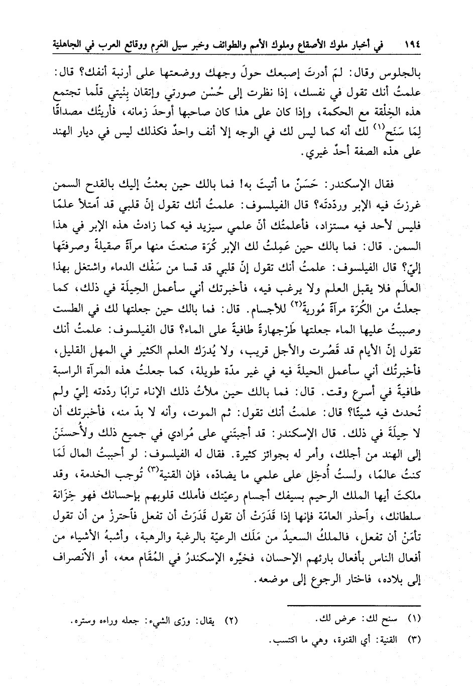 بالجلوس وقال : لم أدرت إصبعك حول وجهك ووضعتها على أرنبة أنفك ؟ علمت أنك تقول في نفسك ، إذا نظرت إلى حسن صورتي وإتقان بنيتي قلما تجتمع هذه الخلقة مع الحكمة ، وإذا كان على هذا كان صاحبها أوحد زمانه ، فأريتك مصداقاً لما سنح لك أنه كما ليس لك في الوجه إلا أنف واحد فكذلك ليس في ديار الهند على هذه الصفة أحد غيري . فقال الإسكندر : حسن ما أتيت به فما بالك حين بعثت إليك بالقدح السمن غرزت فيه الإبر وزرددته ؟ قال الفيلسوف : علمت أنك تقول إن قلبي قد امتلأ علماً فليس لأحد فيه مستزاد ، فأعلمتك أن علمي سيزيد فيه كما زادت هذه الإبر في هذا السمن . قال : فما بالك حين عملت لك الإبر كرة صنعت منها مرآة صقيلة وصرفتها إلي ؟ قال الفيلسوف : علمت أنك تقول إن قلبي قد قسا من سفك الدماء واشتغل بهذا العالم فلا يقبل العلم ولا يرغب فيه ، فأخبرتك ني سأعمل الحيلة في ذلك ، كما جعلت من الكرة مرآة مورية للأجسام . قال : فما بالك حين جعلتها لك في الطست وصببت عليها الماء جعلتها طرجهالة طافية على الماء ؟ قال الفيلسوف : علمت أنك تقول إن الأيام قد قصرت والأجل قريب ، ولا يدرك العلم الكثير في المهل القليل ، فأخبرتك أني سأعمل الحيلة فيه في غير مدة طويلة ، كما جعلت هذه المرآة طافية في أسرع وقت . قال : فما بالك حين ملأت ذلك الإناء تراباً ردده إلي ولم تحدث فيه شيئاً ؟ قال : علمت أنك تقول : ثم الموت ، وأنه لا بد منه ، فأخبرتك أن لا حيلة في ذلك . قال الإسكندر : قد أجبتني على مرادي في جميع ذلك ولأحسنن إلى الهند من أجلك ، وأمر له بجوائز كثيرة . فقال له الفيلسوف : لو أحببت المال لما كنت عالماً ، ولست أدخل على علمي ما يضاده ، فإن القينة توجب الخدمة ، وقد ملكت أيها الملك الرحيم بسيفك أجسام رعيتك فأملك قلوبهم بإحسانك فهو خزانة سلطانك ، واحذر العامة فإنها إذا قدرت أن تقول قدرت أن تفعل فاحترز من أن تقول تأمن أن تفعل ، فالملك السعيد من ملك الرعية بالرغبة والرهبة ، وأشبه الأشياء من أفعال الناس بأفعال بارئهم الإحسان ، فحيره الإسكندر في المقام معه ، أو الإنصراف إلى بلاده ، فاختار الرجوع إلى موضعه .