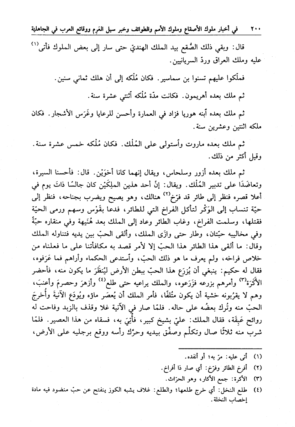 وقيل أكثر من ذلك . ثم ملك بعده أزور وسلحاس ، ويقال إنهما كانا أخوين . قال : فأحسنا السيرة ، وتعاضدا على تدبير الملك . ويقال : إن أحد هذين الملكين كان جالساً ذات يوم في أعلا قصره فنظر إلى طائر قد فرخ هنالك ، وهو يصيح ويضرب بجناحه ، فنظر إلى حية تنساب إلى الوكر لتأكل الفراخ التي للطائر ، فدعا بقوس وسهم ورمى الحية فقتلها ، وسلمت الفراخ ، وغاب الطائر وعاد إلى الملك بعد هنيهة وفي منقاره حبة وفي مخاليبه حبتان ، وطار حتى وازى الملك ، وألقى الحب بين يديه فتناوله الملك وقال : ما ألقى هذا الطائر هذا الحب إلا لأمر قصد به مكافاتنا على ما فعلناه من خلاص فراخه ، ولم يعرف ما هو ذلك الحب ، واستدعى الحكماء وآراهم فما عرفوه ، فقال له حكيم ، ينبغي أن يزرع هذا الحب ببطن الأرض لينظر ما يكون منه ، فأحضر الأكرة وأمرهم بزرعه فزرعوه ، والملك يراعيه حتى طلع وأزهر وحصرم وأعنب ، وهم لا يقربونه خشية أن يكون متلفاً ، فأمر الملك أن يعصر ماؤه ويودع الآنية وأخرج الحب منه وترك بعضه على حاله . فلما صار في الآنية غلا وقذف بالزبد وفاحت له روائح عبقة ، فقال الملك : علي بشيخ كبير ، فأتي به ، فسقاه من هذا العصير . فلما شرب منه ثلاثاً صال وتكلم وصفق بيديه وحرك رأسه ووقع برجليه على الأرض ،