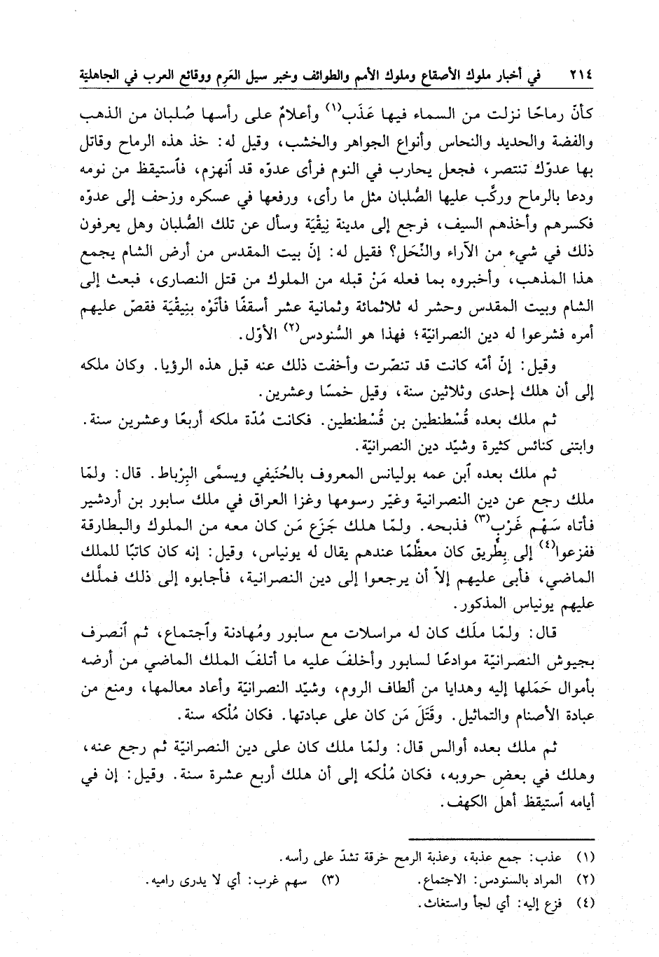كأن رماحاً نزلت من السماء فيها عذب وأعلام على رأسها صلبان من الذهب والفضة والحديد والنحاس وأنواع الجواهر والخشب ، وقيل له : خذ هذه الرماح وقاتل بها عدوك تنتصر ، فجعل يحارب في النوم فرأى عدة قد انهزم ، فاستيقظ من نومه ودعا بالرماح وركب عليها الصلبان مثل ما رأى ، ورفعها في مسكره وزحف إلى عدوة فكسرهم وأخذهم السيف ، فرجع إلى مدينة نيقية وسأل عن تلك الصلبان وهل يعرفون ذلك في شيء من الآراء والنحل ؟ فقيل له : إن بيت المقدس من أرض الشام يجمع هذا المذهب ، وأخبروه بما فعله من قبله من الملوك من قتل النصارى ، فبعث إلى الشام وبيت المقدس وحشر له ثلثمائة وثمانية عشر أسقفا فأتوه بنيقية قفص عليهم أمره فشرعوا له دين النصرانية . فهذا هو السنودس الأول .