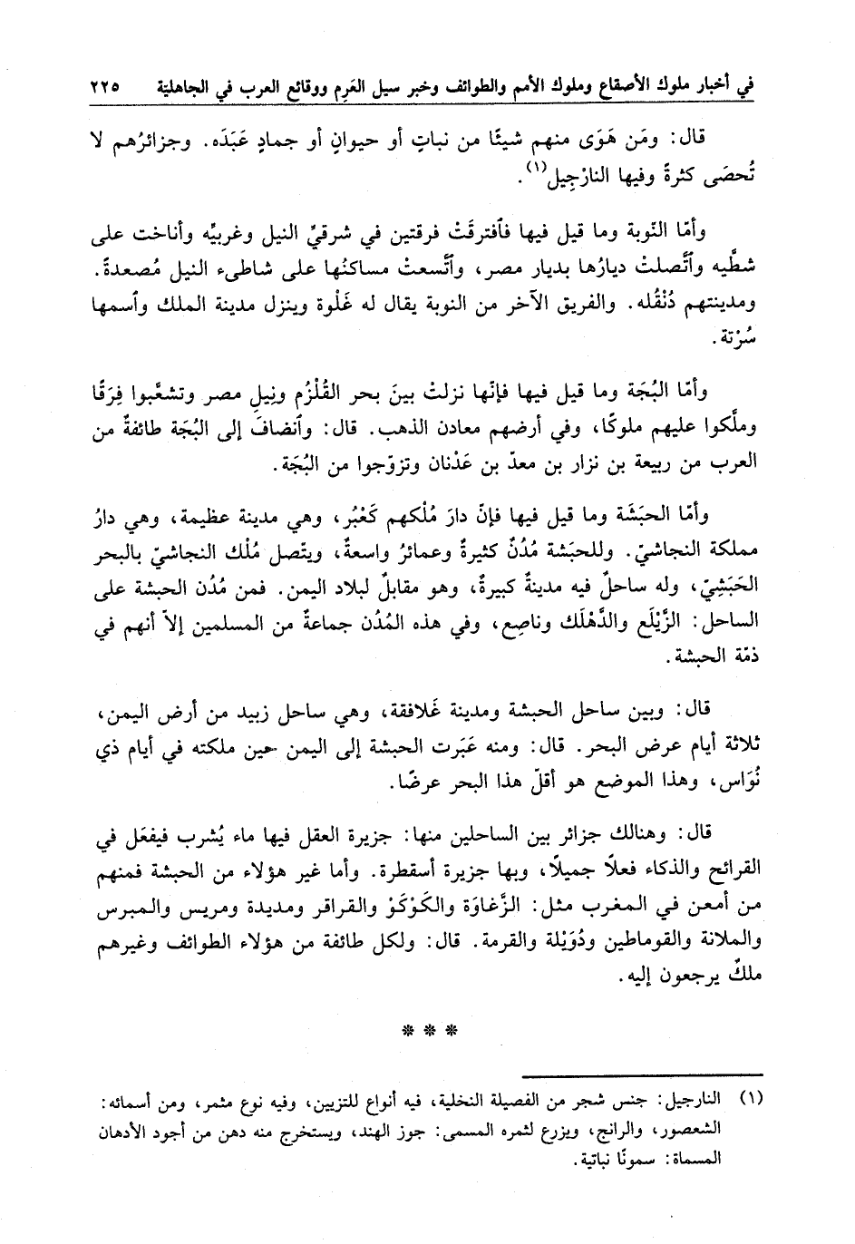 قال : وهنالك جزائر بين الساحلين منها : جزيرة العقل فيها ما ء يشرب فيفعل في القرائح والذكاء فعلاً جميلاً ، وبها جزيرة أسقطرة . وأما غير هؤلاء من الحبشة فمنهم من أمعن في المغرب مثل : الزغاوة والكوكو القراقر ومديدة ومريس والمبرس والملانة والقوماطين ودويله والقرمة . قال : ولكل طائفة من هؤلاء الطوائف وغيرهم ملك يرجعون إليه .