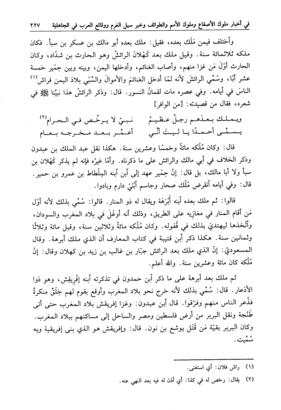 واختلف فيمن ملك بعده ، فقيل : ملك بعده أبو مالك بن عسكر بن سبأ . فكان ملكه ثلثمائة سنة . وقيل ملك بعد كهلان الرائس وهو الحارث بن شداد ، وكان الحارث أول من غزا منهم ، وأصاب الغنائم ، وأدخلها اليمن ، وبينه وبين حمير خمسة عشر أباً ، وسمى الرائس لأنه لما أدخل الغنائم والأموال والسبي بلاد اليمن فراش الناس في أيامه . وفي عصره مات لقمان النسور . قال : وذكر الرائش هذا نبينا ( صلى الله عليه وسلم ) في شعره ، فقال من قصيدته :