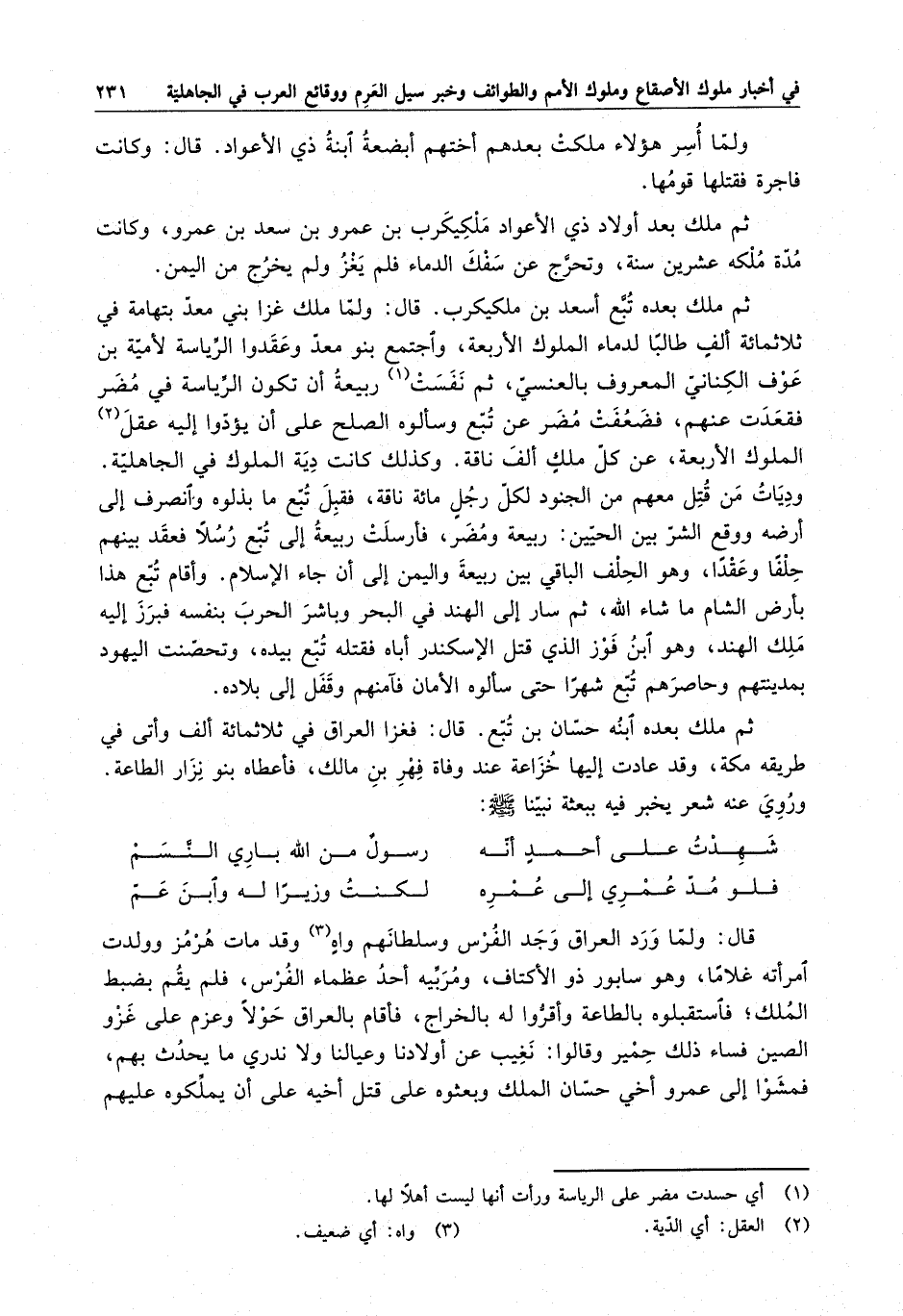 قال : ولما ورد العراق وجد الفرس وسلطانهم واه وقد مات هرمز وولدت امرأته غلاماً ، وهو سابور ذو الأكتاف ، ومربية أحد عظماء الفرس ، فلم يقم بضبط الملك ؛ فاستقبلوه بالطاعة وأقروا له بالخراج ، فأقام بالعراق حولاً وعزم على غزو الصين فساء ذلك حمير وقالوا : نعيب عن أولادنا وأعيالنا ولا ندري ما يحدث بهم ، فمشوا إلى عمرو أخي حسان الملك وبعثوه على قتل أخيه على أن يملكوه عليهم