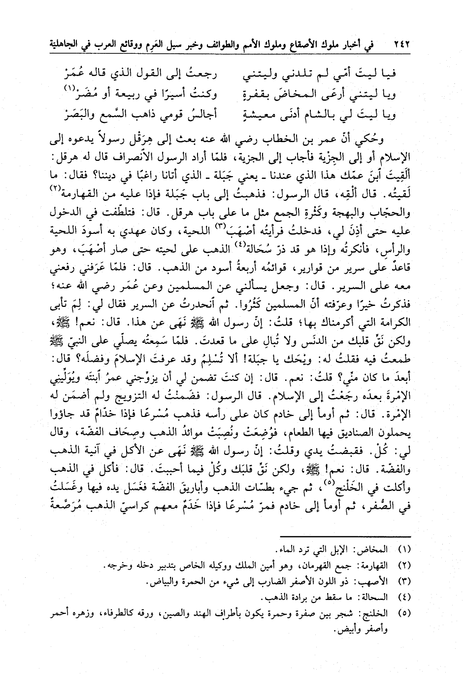 ثم انحدوا عن السرير فقال لي : لم تأبى الكرامة التي أكرمناك بها ؛ قلت : إن رسول الله ( صلى الله عليه وسلم ) نهى عن هذا . قال : نعم ؟ ( صلى الله عليه وسلم ) ، ولكن نق قلبك من الدنس ولا تبال على ا قعدت . فلما سمعته يصلي على النبي ( صلى الله عليه وسلم ) طمعت فيه فقلت له : ويحك يا جبلة ؟ ألا تسلم وقد عرفت الإسلام وفضله ؟ قال : أبعدما كان مني ؟ قلت : نعم . قال : إن كنت تضمن لي أن يزوجني عمر ابنته ويوليني الإمرة بعده رجعت إلى الإسلام . قال الرسول : فضمنت له التزويج ولم أضمن له الغمرة . قال : ثم أومأ إلى خادم ما ن على رأسه فذهب مسرعاً فإذا خدام قد جاءوا يحملون الصناديق فيها الطعام ، فوضعت ونصبت موائد الذهب وصحاف الفضة ، قال لي : كل ، فقبضت يدي وقلت : إن رسول الله ( صلى الله عليه وسلم ) نهى عن الأكل في آنية الذهب والفضة . قال : نعم ؟ ( صلى الله عليه وسلم ) ، ولكن نق قلبك وكل فيما أحببت . قال : فأكل في الذهب وأكلت في الخلنج ، ثم جئ بطسات الذهب وأباريق الفضة فغسل يده فيها وغسلت في الصفر ، ثم أومأ إلى خادم فمر مسرعاً فإذا خدم معهم كراسي الذهب مرصعة