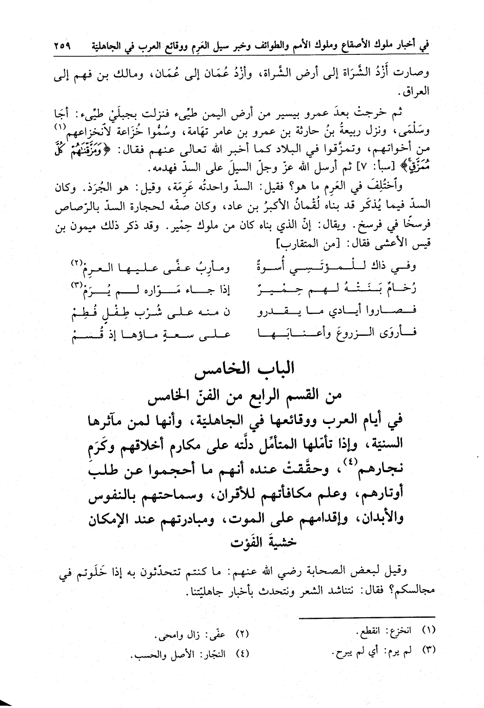 الباب الخامس من القسم الرابع من الفن الخامس في أيام العرب ووقائعها في الجاهلية وأنها لمن مآثرها السنية ، وإذا تأملها المتأمل دلته على مكارم أخلاقهم وكرم نجارهم ، وحققت عنده أنهم ما أحجموا عن طلب أوتارهم ، وعلم مكافأتهم للأقران ، وسماحتهم بالنفوس والأبدان وإقدامهم على الموت ، ومبادرتهم عند الإمكان خشية الفوت