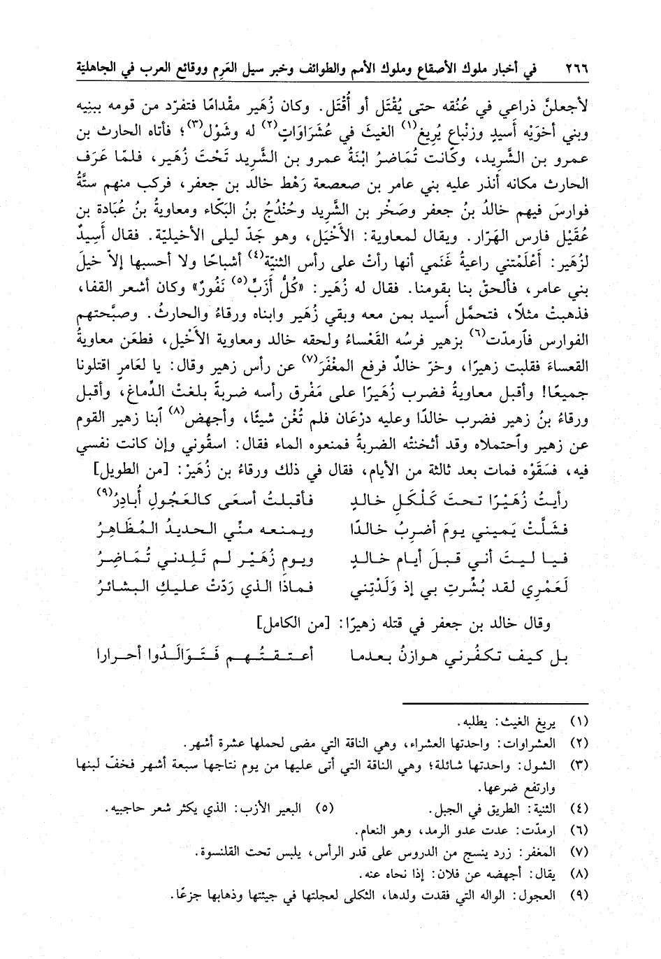 لأجعلن ذراعي في عنقه حتى يقتل أو أقتل . وكان زهير مقداماً فتفرد من قومه ببنيه وبني أخويه أسيد وزيناع يريغ الغيث في عشرواوات له وشول ؛ فأتاه الحارث بن عمرو ابن الشريد ، وكانت تماضر بنة عمرو بن الشريد تحت زهير ، فلما عرف الحارث مكانه أنذر عليه بني عامر بن صعصعة رهط خالد بن جعفر ، فركب منهم ستة فوارس فيهم خالد بن جعفر وصخر بن الشريد وحندج بن البكاء ومعاوية بن عبادة ابن عقيل فارس الهرار . ويقال لمعاوية : الأخيل ، وهو جد ليلى الأخيلية . فقال أسد لزهير : أعلمتني راعية غنمي أنها رأت على راس الثنية أشباحاً ولا أحسبها إلا خيل بني عامر ، فألحق بنا بقومنا . فقال له زهير : كل أزب نفور وكان أشعر القفا ، فذهبت مثلاً ، فتحمل أسيد بمن معه وبقي زهير وابناه ورقاء والحارث . وصبحتهم الفوارس فارمدت بزهير فرسه القعساء ولحقه خالد ومعاوية الأخيل ، فطعن معاوية القعساء فقلبت زهيراً ، وخر خالد فرفع المغفر عن راس زهير وقال : يا لعامر اقتلونا جميعاًّ وأقبل معاوية فضرب زهيراً على مفرق رأسه ضربة بلغت الدماغ ، وأقبل ورقاء بن زهير فضرب خالداً وعليه درعان فلم تغن شيئاً ، وأجهض ابنا زهير القوم عن زهير واحتملاه وقد أثخنته الضربة فمنعوه الماء فقال : اسقوني وغن كانت نفسي فيه ، فسقوه فمات بعد ثالثة من الأيام ، فقال في ذلك ورقاء بن زهير :