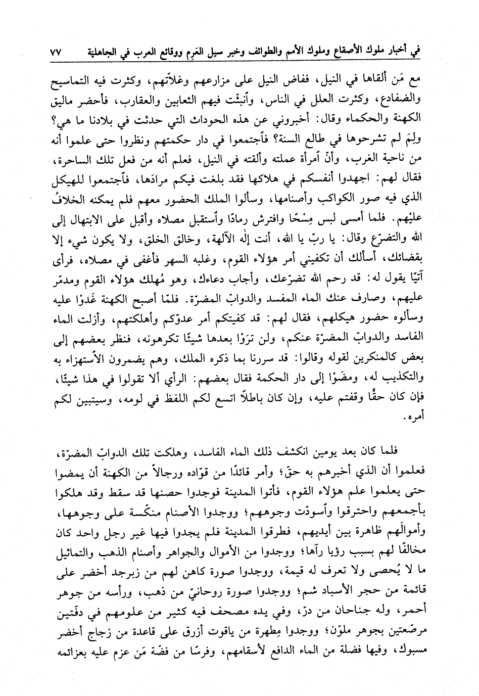 مع من ألقاها في النيل ، ففاض النيل على مزارعهم وغلاتهم ، وكثرت فيه التماسيح والضفادع ، وكثرت العل في الناس ، وانبثت فيهم الثعابين والعقارب ، فاحضر ماليق الكهنة والحكماء وقال : أخبروني عن هذه الحوادث التي حدثت في بلادنا ما هي ؟ ولم لم تشرحوها في طالع السنة ؟ فاجتمعوا في دار حكمتهم ونظروا حتى علموا أنه من ناحية الغرب ، وأن امرأة عملته وألقته في النيل ، فعلم أنه من فعل تلك الساحرة ، فقال لهم : اجهدوا أنفسكم في هلاكها فقد بلغت فيكم مرادها ، فاجتمعوا للهيكل الذي فيه صور الكواكب وأصنامها ، وسألوا الملك الحضور معهم فلم يمكنه الخلاف عليهم . فلما أمسى لبس مسحا وافترش رماداً واستقبل مصلاه وأقبل على الابتهال إلى الله والتضرع وقال : يارب يا الله ، أنت إله الآلهة ، وخالق الخلق ، ولا يكون شيء إلا بقضائك ، أسألك أن تكفينين أمر هؤلاء القوم ، وغلبه السهر فأغفى في مصلاه ، فرأى آتياً يقول له : قدر حم الله تضرعك ، وأجاب دعاءك ، وهو مهلك هؤلاء القوم ومدمر عليهم ، وصارف عنك الماء المفسد والدواب المضرة . فلما أصبح الكهنة غدوا عليه وسألوه حضور هيكلهم ، فقال لهم : قد كفيتكم أمر عدوكم وأهلكتهم ، وأزلت الماء الفاسد والدواب المضرة عنكم ، ولن تروا بعدها شيئاً تكرهونه ، فنظر بعضهم إلى بعض كالمنكرين لقوله وقالوا : قد سررنا بما ذكره الملك ، وهم يضمرون الاستهزاء به والتكذيب له ، ومضوا إلى دار الحكمة فقال بعضهم : الرأي ألا تقولوا في هذا شيئاً فإن كان حقاً وقفتم عليه ، وإن كان باطلاً اتسع لكم اللفظ في لومه ، وسيتبين لكم أمره . فلما كان بعد يومين انكشف ذلك الماء الفاسد ، وهلكت تلك الدواب المضرة ، فعلموا أن الذي أخبرهم به حق ؛ وأمر قائداً من قواده ورجالاً من الكهنة أن يمضوا حتى يعلموا علم هؤلاء القوم ، فأتوا المدينة فوجدوا حصنها قد سقط وقد هلكوا بأجمعهم واحترقوا واسودت وجوههم ؛ ووجدوا الأصنام منكسة على وجوهها ، وأموالهم ظاهرة بين أيديهم ، فطرقوا المدينة فلم يجدوا فيها غير رجل واحد كان مخالفاً لهم بسبب رؤيا رآها ؛ ووجدوا من الأموال والجواهر وأصنام الذهب والتماثيل ما لا يحصى ولا تعرف له قيمة ، ووجدوا صورة كاهن لهم من زبرجد أخضر على قائمة من حجر الأسباد شم ، ووجدوا صورة روحاني من ذهب ، ورأسه من جوهر أحمر ، وله جناحان من در ، وفي يده مصحف فيه كثير من علومهم في دفتين مرصعتين بجوهر ملون ؛ ووجدوا مطهرة من ياقوت أزرق على قاعدة من زجاج أخضر مسبوك ، وفيها فضلة من الماء الدافع لأسقامهم ، وفرساً من فضة من عزم عليه بعزائمه