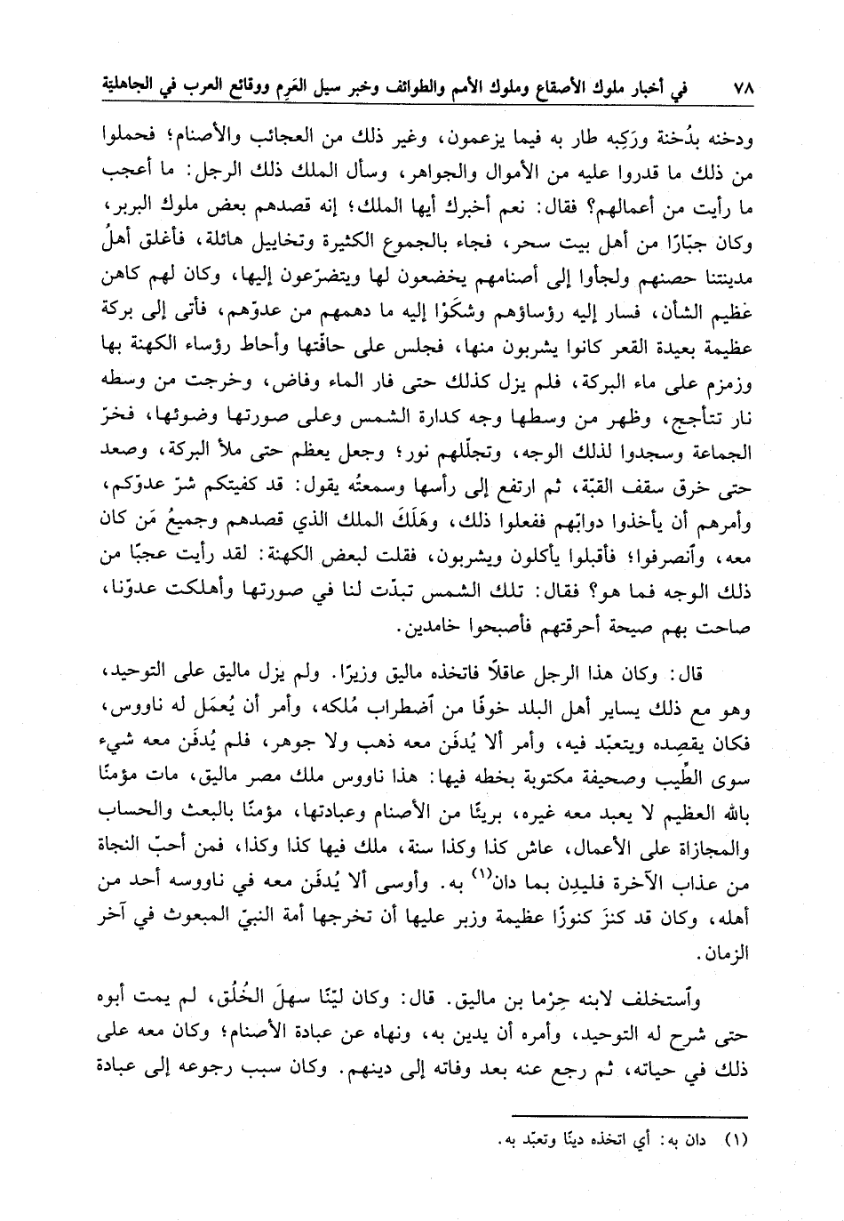 ودخنه بدخنة وركبه طار به فيما يزعمون ، وغير ذلك من العجائب والأصنام ؛ فحملوا من ذلك ما قدروا عليه من الأموال والجواهر ، وسأل الملك ذلك الرجل : ما أعجب ما رأيت من أعمالهم ؟ فقال : نعم أخبرك أيها الملك ؛ إنه قصدهم بعض ملوك البربر ، وكان جباراً من أهل بيت سحر ، فجاء بالجموع الكثيرة وتخابيل هائلة ، فأغلق أهل مدينتنا حصنهم ولجأوا إلى أصنامهم يخضعون لها ويتضرعون إليها ، وكان لهم كاهن عظيم الشأن ، فسار إليه رؤساؤهم وشكوا إليه ما دهمهم من عدوهم ، فأتى إلى بركة عظيمة بعيدة القعر كانوا يشربون منها ، فجلس على حافتها وأحاط رؤساء الكهنة بها وزمزم على ماء البركة ، فلم يزل كذلك حتى فار الماء وفاض ، وخرجت من وسطه نار تتأجج من وسطها وجه كدارة الشمس وعلى صورتها وضوئها ، فخر الجماعة وسجدوا لذلك الوجه ، وتجللهم نور ؛ وجعل يعظم حتى ملأ البركة ، وصعد حتى خرق سقف القبة ، ثم ارتفع إلى رأسها وسمعنه يقول : قد كفيتكم شر عدوكم ، وأمرهم أن يأخذوا دوابهم ففعلوا ذلك ، وهلك الملك الذي قصدهم وجميع من كان معه ، وانصرفوا ؛ فأقبلوا يأكلون ويشربون ، فقلت لبعض الكهنة : لقد رأيت عجباً من ذلك الوجه فما هو ؟ فقال : تلك الشمس تبدت لنا في صورتها وأهلكت عدونا ، صاحت بهم صيحة أحرقهم فأصبحوا خامدين .
