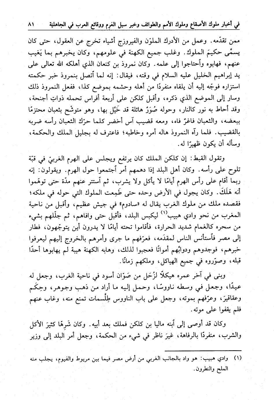 ممن تقدمه . وعمل من الأدرك الملون والفيروزج تخرج عن العقول ، حتى يسمى حكيم الملوك . وغلب جميع الكهنة في علومهم ، وكان يخبرهم بما يغيب عنهم ، فهابوه واحتاجوا إلى علمه . وكان نمرود بن كنعان الذي أهلكه الله تعالى على يد إبراهيم عليه السلام في وقته ، فيقال : إنه لما اتصل بنمرود خبر حكمته استزاره فوجه إليه أن يلقاه منفرداً من أهله وحشمه بموضع كذا ، ففعل النمرود ذلك وسار إلى الموضع الذي ذكره ، وأقبل كلكن على أربعة أفراس تحمله ذوات أجنحة ، وقد أحاط به نور كالنار ، وحوله صور هائلة قد خيل بها ، وهو متوشح بثعبان محتزماً ببعضه ، والثعبان فاغر فاه ، ومعه قضيب آس أخضر كلما حرك الثعبان رأسه ضربه بالقضيب . فلما رآه النمرود هاله أمره وخاطبه ؛ فاعترف له بجليل الملك والحكمة ، وسأله أن يكون ظهيراً له . وتقول القبط : إن كلكن الملك كان يرتفع ويجلس على الهرم الغربي في قبة تلوح على رأسه . وكان أهل البلد إذا دهمهم أمر اجتمعوا حول الهرم . ويقولون : إنه ربما أقام على راس الهرم أياماً لا يأكل ولا يشرب ، ثم استتر عنهم مدة حتى توهموا أنه هلك . وكان يجول في الأرض وحده حتى طمعت الملوك التي حوله في ملكه ؛ فقصده ملك من ملوك الغرب يقال له سادوم في جيش عظيم ، واقبل من ناحية المغرب من نحو وادي هبيب ليكبس البلد ، فأقبل حتى وافاهم ، ثم جللهم بشيء من سحره كالغمام شديد الحرارة ، فأقاموا تحته أياماً لا يدرون أين يتوجهون ، فطار إلى مصر فاستأنس الناس لمقدمه ، فعرفهم ما جرى وأمرهم بالخروج إليهم ليعرفوا خبرهم ، فوجدوهم ودوابهم أمواتاً فعجبوا لذلك ، وهابه الكهنة هيبة لم يهابوها أحداً قبله وصوروه في جميع الهياكل ، وملكهم زماناً .