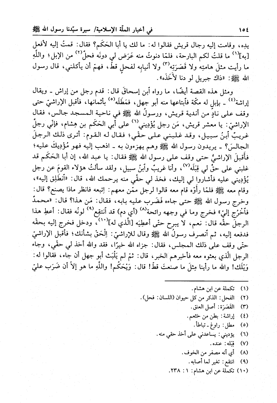 يده ، وقامت إليه رجال قريش فقالوا له : مالك يا أبا الحكم ؟ فقال : قمت إليه لأفعل به ما قلت لكم البارحة ، فلما دنوت منه عرض لي دونه فحلٌ من الإبل ؛ والله ما رأيت مثل هامته ولا قصرته ولا انيابه لفحلٍ قط ، فهمايأكلني . قال رسول الله ( صلى الله عليه وسلم ) : ذاك جبريل لو دنا لأخذه . ومثل هذه القصة أيضا ما رواه ابن إسحاق قال : قدم رجل من إراش - ويقال إراشة - بإبلٍ له مكة فابتاعها منه أبو جهل ، فمطله بأثمانها فأقبل الإراشي حتى وقف على نادٍ من اندية قريش ، ورسول الله ( صلى الله عليه وسلم ) في ناحية المسجد جالس ، فقال الإراشي : يا معشر قريش ، من رجل يؤذيني على أبي الحكم بن هشام ؛ فاني رجلٌ غريبٌ ابن سبيل ، وقد غلبني عل حقي ؛ فقال له القوم : أترى ذلك الرجل الجالس ؟ - يريدون رسول الله ( صلى الله عليه وسلم ) وهم يهزءون به - اذهب إليه فهو مؤديك عليه ؛ فأقبل الإراشي حتى وقف على رسول الله ( صلى الله عليه وسلم ) فقال : يا عبد الله ، ان أبا الحكم قد غلبني على حقٍ لي قبله ، وانا غريبٌ وابن سبيل ، ولقد سألت هؤلاء القوم عن رجل يؤديني عليه فأشاروا لي إليك ، فخذ لي حقي منه يرحمك الله ، قال : انطلق إليه ، وقام معه ( صلى الله عليه وسلم ) فلما رأوه قام معه قالوا لرجل ممن معهم : اتبعه فانظر ماذا يصنع ؟ قال : وخرج رسول الله ( صلى الله عليه وسلم ) حتى جاءه فضرب عليه بابه ، فقال : من هذا ؟ قال : محمدٌ فاخرج إلي فخرج وما في وجهه رانحة أي دم قد انتقع لونه فقال : أعط هذا الرجل حقه قال : نعم ، لا يبرح حتى أعطيه الذي له ، ودخل فخرج إليه بحقه فدفعه إليه ، ثم انصرف رسول الله ( صلى الله عليه وسلم ) وقال للإراشي : الحق بشانك ؛ فأقبل الإراشي حتى وقف على ذلك المجلس ، فقال : جزاه الله خيرا فقد والله أخذ لي حقي ، وجاء الرجل الذي بعثوه معه فأخبرهم الخبر ، قال : ثم لم يلبث أبو جهلاجاء ، فقالوا له : ويلك ؟ والله ما رأينا مثل ما صنعت قط قال : ويحكم والله ما هو إل ان اضرب علي