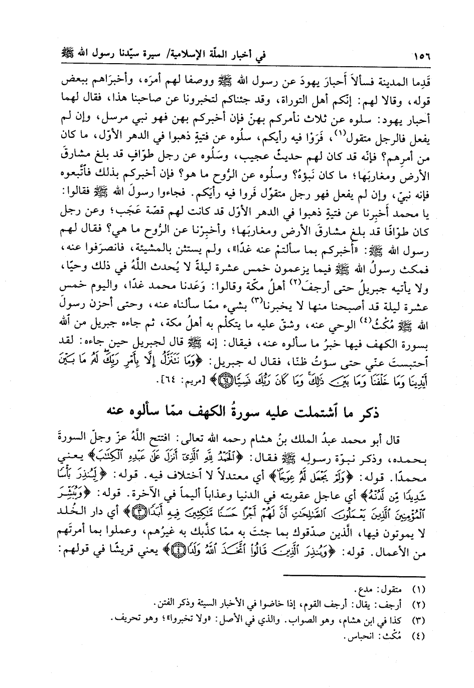 قدما المدينة فسألا أحبار يهود عن رسول الله ( صلى الله عليه وسلم ) ووصفا لهم أمره ، وأخبراهم ببعض قوله ، وقالا لهم : انكم أهل التوراة ، وقد جئناكم لتخبرونا عن صاحبنا هذا فقال لهما أحبار يهود : سلوه عن ثلاث نأمركم بهن ، فا أخبركم بهن فهو نبي مرسل ، وا لم يفعل فالرجل متقول ، فرواً فيه رأيكم ، سلوه عن فتيةٍ ذهبوا في الدهر الأول ، ما كان من أمرهم ؟ فانه قد كان لهم حديثٌ عجيب ؛ وسلوه عن رجل طوافٍ قد بلغ مشارق الأرض ومغاربها ؛ ما كان نبؤه ؟ وسلوه عن الروح ما هو ؟ فا أخبركم بذلك فاتبعوه فانه نبي ، وا لم يفعل فهو رجل متقول فروا فيه رأيكم . فجاءوا رسول الله ( صلى الله عليه وسلم ) فقالوا : يا محمد ، أخبرنا عن فتيةٍ ذهبوا في الدهر الأول قد كانت لهم قصة عجب ؛ وعن رجل كان طوافاً قد بلغ مشارق الأرض ومغاربها ؛ وأخبرنا عن الروح ما هي ؟ فقال لهم رسول الله ( صلى الله عليه وسلم ) : أخبركم بما سألتم عنه غدا ولم يستثن بالمشيئة ، فانصرفوا عنه ، فمكث رسول الله ( صلى الله عليه وسلم ) فيما يزعمون خمس عشرة ليلةً لا يحدث الله في ذلك وحيا ولا يأتيه جبريل حتى أرجف أهل مكة وقالوا : وعدنا محمد غدا واليوم خمس عشرة ليلة قد أصبحنا منها لا يخبرنا بشيء مما سألناه عنه ، وحتى أحزن رسول الله ( صلى الله عليه وسلم ) مكث الوحي عنه ، وشق عليه ما يتكلم به أهل مكة ؛ ثم جاءه جبريل من الله بسورة الكهف فيها خبر ما سألوا عنه ، فيقال : انه ( صلى الله عليه وسلم ) قال لجبريل حين جاءه : لقد احتبست عني حتى سؤت ظناً ؛ فقال له جبريل : " وَمَا نَتَنَزَّلُ إلاَّ بِأمْرِ رَبِّكَ لَهُ مَا بَيْنَ أيْدِينَا وَمَا خَلْفَنَا وَمَا بَيْنَ ذَلِكَ وَمَا كان رَبُّكَ نَسِياً " .
