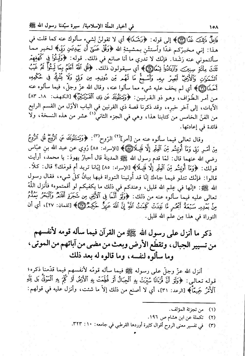 فَاعِلٌ ذَلِكَ غَداً إلاَّ ان " إلى قوله " رَشَداً " أي لا تقولن لشيء سألوك عنه كما قلت في هذا : اني مخبركم غدا واستثن بمشيئة الله " وَقُلْ عَسَىايَهْدِيَنِ رَبِّي " الخير مما سألتموني عنه رشدا فانك لا تدري ما انا صانع في ذلك . قوله : " وَلَبِثُوا في كَهْفِهِمْ ثَلثَمِائَةٍ سِنِينَ وَازْدَادُوا تِسْعاً " أي سيقولون ذلك . " قُلِ اللهُ أعْلَمُ بِمَا لَبِثُوا لَهُ غَيْبُ السَّموَاتِ وَالأْرْضِ أبْصِرْ بِهِ وَأسْمِعْ مَا لَهُمْ مِنْ دُونِهِ مِنْ وَليٍّ وَلاَ يُشْرِكُ في حُكْمِهِ أحَداً " أي لم يخف عليه شيء مما سألوا عنه ، وقال الله عز وجل ، فيما سألوه عنه من أمر الطواف ، وهو ذو القرنين : " وَيَسْألُونَكَ عَنْ ذي الْقَرْنَيْنِ " الآيات ، إلى آخر خبره . وقد ذكرنا قصة ذي القرنين في الباب الأول من القسم الرابع من الفن الخامس من كتابنا هذا وهي في الجزء الثاني عشر من هذه النسخة ، ولا فائدة في إعادتها .