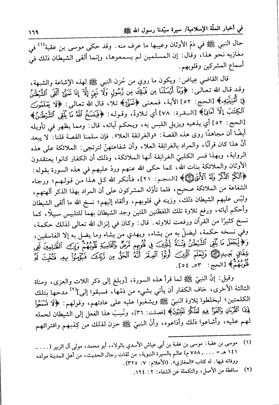حال النبي ( صلى الله عليه وسلم ) في ذم الأوثا وعيبها ما عرف منه . وقد حكى موسى بن عقبة في مغازيه نحو هذا وقال : أن المسلمين لم يسمعوها وانما ألقى الشيطان ذلك في أسماع المشركين وقلوبهم . قال القاضي عياض : ويكون ما روى من حزن النبي ( صلى الله عليه وسلم ) لهذه الإشاعة والشبهة ، وقد قال الله تعالى : " وَمَا أرْسَلْنَا مِنْ قَبْلِكَ مِنْ رَسُولٍ وَلاَ نَبيٍّ إلاّ إذَا تَمَنَّى ألْقىَ الشَّيْطَا في أمْنِيّتهِ " الآية ، فمعنى تمنى تلأن قال الله تعالى : " لاَ يَعْلَمُونَ الْكِتَابَ إلاّ أماني " أي تلاوةً ، وقوله : " فَيَنْسَخُ اللهُ مَا يُلْقي الشَّيْطان " أي يذهبه ويزيل اللبس به ، ويحكم آياته ، قال : ومما يظهر في تأويله أيض ان امجاهداً روى هذه القصة : والغرانقة العلا . فا سلمنا القصة قلنا : لا يبعداهذا كان قرانا والمراد بالغرانقة العلأن وا شفاعتهن لترتجى : الملائكة على هذه الرواية ، وبهذا فسر الكلبي الغارنقة انها الملائكة ، وذلك أن الكفار كانوا يعتقدون الأوثان والملائكة بنات الله ، كما حكى الله عنهم ورد عليهم في هذه السورة بقوله : " أَلَكُم الذّكَرُ وَلَه الأنثَى " ، فانكر الله كل هذا من قولهم ؛ ورجاء الشفاعة من الملائكة صحيح ، فلما تأوله المشركون على ان المراد بهذا الذكر آلهتهم ، ولبس عليهم الشيطا ذلك ، وزينه في قلوبهم ، وألقاه إليهم ؛ نسخ الله ما القى الشيطا وأحكم آياته ، ورفع تلاوة تلك اللفظتين اللتين وجد الشيطا بهما للتلبيس سبيلأن كما نسخ كثيراً من القرا ورفعت تلاوته . قال : وكا في انزال الله تعالى لذلك حكمة ، وفي نسخه حكمة ، ليضل به من يشاء ، ويهدي من يشاء وما يضل به إلا الفاسقين ، وَ " لَيْجَعَلَ مَا يُلْقِي الشَّيْطَا فِتْنَةً لِلّذينَ في قُلُوبِهِمْ مَرَضٌ والقَاسِيَةِ قُلُوبُهُمْ وا الظَّالِمينَ لَفي شِقَاقٍ بَعِيدٍ . ولِيَعْلَمَ الّذيِن أُوتُوا الْعِلْمَ انه الْحَقُّ مِن رَّبّكَ فَيُؤْمِنُوا بِهِ فَتُخْبِتَ لَهُ قُلُوبُهُمْ " .