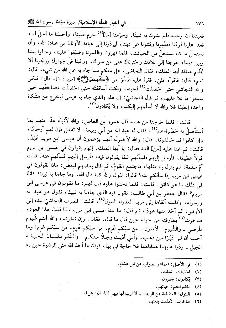 فعبدنا الله وحده فلم نشرك به شيئا وحرمنا ما حرم علينا وأحللنا ما أحل لنا فعدا علينا قومنا فعذبونا وفتنونا عن ديننا ليردونا إلى عبادة الأوثا من عبادة الله ، وا نستحل ما كنا نستحل من الخبائث ، فلما قهرونا وظلمونا وضيقوا علينا وحالوا بيننا وبين ديننا خرجنا إلى بلادك واخترناك على من سواك ، ورغبنا في جوارك ورجونا ألا نظلم عندك أيها الملك ، فقال النجاشي : هل معك مما جاء به عن الله من شيء ، قال : نعم ، قال : فاقرأه علي ، فقرأ عليه صدرا من كهيعص ، قال : فبكى والله النجاشي حتى اخضلت لحيته ، وبكت أساقفته حتى اخضلت مصاحفهم حين سمعوا ما تلا عليهم ، ثم قال النجاشي : اهذا والذي جاء به عيسى ليخرج من مشكاة واحدة انطلقا فلا والله لا أسلمهم إليكما ولا يكادون . قالت : فلما خرجنا من عنده قال عمرو بن العاص : والله آتينه غدا عنهم بما أستأصل به خضراءهم ، فقال له عبد الله بن أبي ربيعة : لا تفعل فا لهم أرحاما وا كانوا قد خالفونا قال : والله لأخبرنه انهم يزعموناعيسى بن مريم عبدٌ . قالت : ثم غدا عليه من الغد فقال : يأيها الملك ، انهم يقولون في عيسى بن مريم قولاً عظيما فأرسل إليهم فاسألهم عما يقولون فيه ، فأرسل إليهم فسألهم عنه . قالت أم سلمة : ولم ينزل بنا مثلها فاجتمع القوم ، ثم قال بعضهم لبعض : ماذا تقولون في عيسى بن مريم إذا سألكم عنه ؟ ، قالوا : نقول والله كما قال الله ، وما جاءنا به نبينا ؛ كائناً في ذلك ما هو كائن . قالت : فلما دخلوا عليه قال لهم : ما تقولون في عيسى بن مريم ؟ فقال جعفر بن أبي طالب : نقول فيه الذي جاءنا به نبينا نقول هو عبد الله ورسوله ، وكلمته ألقاها إلى مريم العذراء البتول ، قالت : فضرب النجاشي بيده إلى الأرض ، ثم أخذ منها عودا ثم قال : ما عدا عيسى بن مريم مما قلت هذا العود . فناخرت بطارقته من حوله حين قال ما قال ، فقال : وا نخرتم ، والله أنتم شيوم بأرضي - والشيوم : الآمنون - من سبكم غرم ، من سبكم غرم ، من سبكم غرم وما أحبالي دبرا من ذهب ، واني آذيت رجلاً منكم - والدبر بلسا الحبشة الجبل - ردوا عليهما هداياهما فلا حاجة لي بها فوالله ما أخذ الله مني الرشوة حين رد
