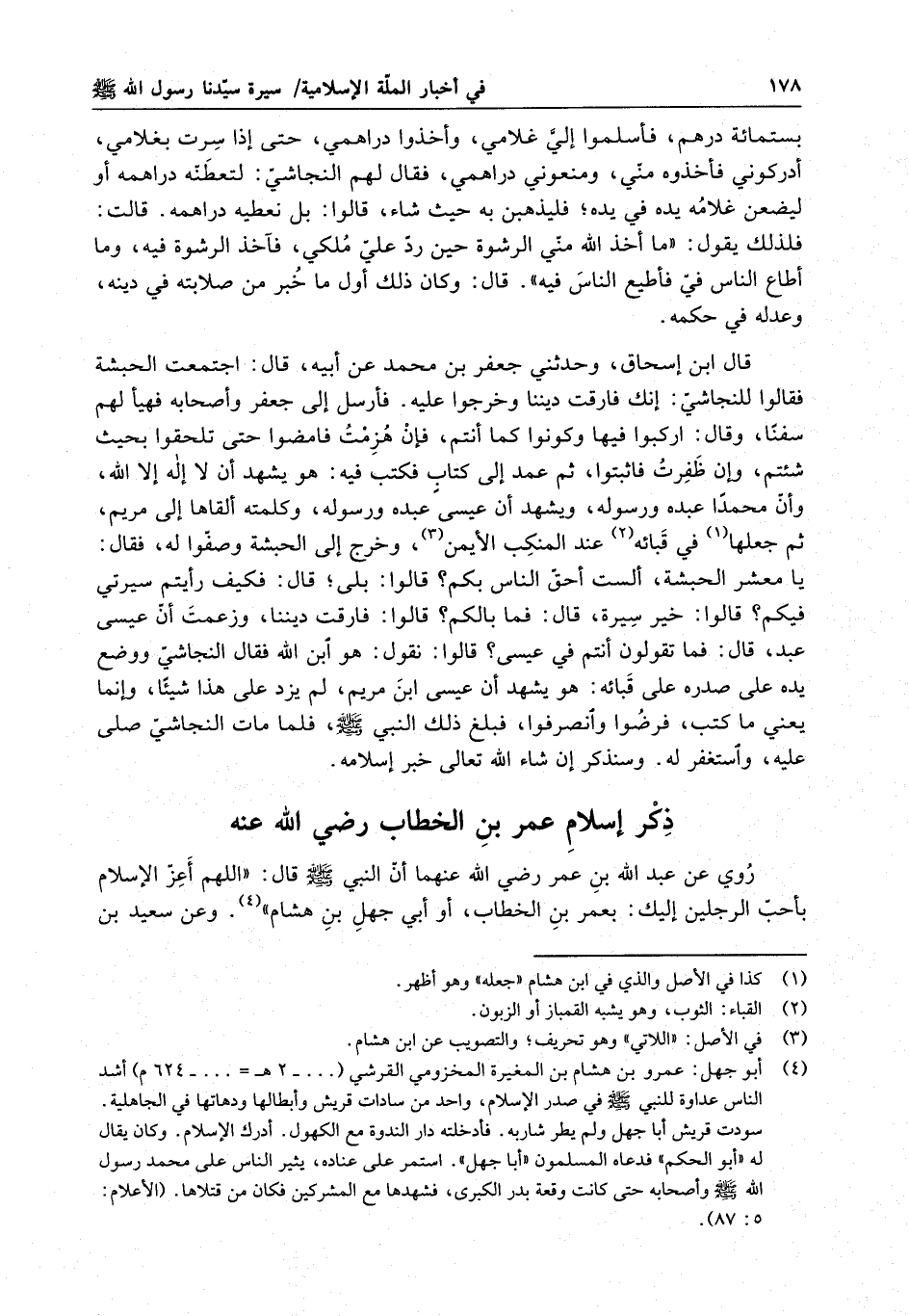 بستمائة درهم ، فأسلموا إلى غلامي ، وأخذوا دراهمي ، حتى إذا سرت بغلامي ؛ أدركوني فأخذوه مني ، ومنعوني دراهمي ، فقال لهم النجاشي : لتعطنه دراهمه أو ليضعن غلامه يده في يده ؛ فليذهبن به حيث شاء ، قالوا : بل نعطيه دراهمه . قالت : فلذلك يقول : ما أخذ الله مني الرشوة حين رد علي ملكي ، فآخذ الرشوة فيه ، وما أطاع الناس في فأطيع الناس فيه . قال : وكا ذلك أول ما خبر من صلابته في دينه ، وعدله في حكمه . قال ابن إسحاق ، وحدثني جعفر بن محمد عن أبيه ، قال : اجتمعت الحبشة فقالوا للنجاشي : انك فارقت ديننا وخرجوا عليه . فأرسل إلى جعفر وأصحابه فهيأ لهم سفنا وقال : اركبوا فيها وكونوا كما أنتم ، فا هزمت فامضوا حتى تلحقوا بحيث شئتم ، وا ظفرت فاثبتوا . ثم عمد إلى كتابٍ فكتب فيه : هو يشهدالا إله إلا الله ، وا محمداً عبده ورسوله ، ويشهداعيسى عبده ورسوله ، وكلمته ألقاها إلى مريم ، ثم جعلها في قبائه عند المنكب الأيمن ، وخرج إلى الحبشة وصفوا له ، فقال : يا معشر الحبشة ، أست أحق الناس بكم ؟ قالوا : بلى ؛ قال : فكيف رأيتم سيرتي فيكم ؟ قالوا : خير سيرة ، قال : فما بالكم ؟ قالوا : فارقت ديننا وزعمتاعيسى عبد ، قال : فما تقولون أنتم في عيسى ؟ قالوا : نقول : هو ابن الله فقال النجاشي ووضع يده على صدره على قبائه : هو يشهداعيسى بن مريم ، لم يزد على هذا شيئا وانما يعني ما كتب ، فرضوا وانصرفوا فبلغ ذلك النبي ( صلى الله عليه وسلم ) ، فلما مات النجاشي صلى عليه ، واستغفر له . وسنذكراشاء الله تعالى خبر إسلامه .