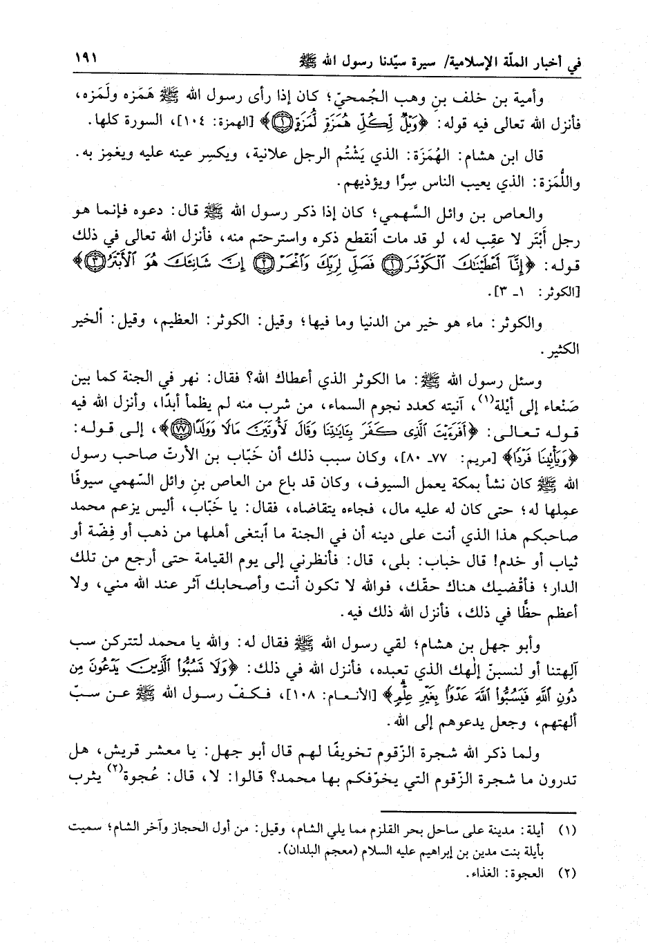 قال ابن هشام : الهمزة : الذي يشتم الرجل علأنية ، ويكسر عينه عليه ويغمز به . واللمزة : الذي يعيب الناس سراً ويؤذيهم . والعاص بن وائل السهمي ؛ كان إذا ذكر رسول الله ( صلى الله عليه وسلم ) قال : دعوه فانما هو رجل أبتر لا عقب له ، لو قد مات انقطع ذكره واسترحتم منه ، فانزل الله تعالى في ذلك قوله : " انا أعْطَيْنَاكَ الْكَوْثَرَ . فَصَلِّ لِرَبِّكَ وانحَرْ . اشانئَكَ هُوَ الأبْتَرُ " .