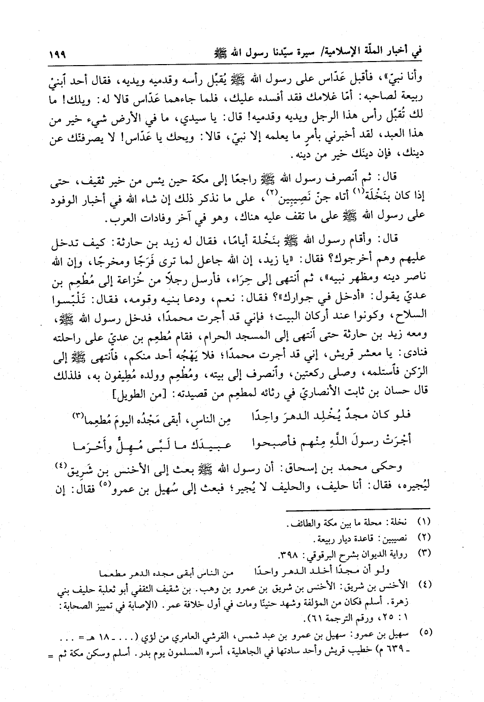 قال : ثم انصرف رسول الله ( صلى الله عليه وسلم ) راجعاً إلى مكة حين يئس من خير ثقيف ، حتى إذا كان نخلة أتاه جن نصيبين ، على ما نذكر ذلكاشاء الله في أخبار الوفود على رسول الله ( صلى الله عليه وسلم ) على ما تقف عليه هناك ، وهو في آخر وفادات العرب . قال : وأقام رسول الله ( صلى الله عليه وسلم ) بنخلة أياما فقال له زيد بن حارثة : كيف تدخل عليهم وهم أخرجوك ؟ فقال : يا زيد ، إن الله جاعل لما ترى فرجاً ومخرجا وان الله ناصر دينه ومظهر نبيه ، ثم انتهى إلى حراء ، فأرسل رجلاً من خزاعة إلى مطعم بن عدي يقول : أدخل في جوارك ؟ فقال : نعم ، ودعا بنيه وقومه ، فقال : تلبسوا السلاح ، وكونوا عند أركا البيت ؛ فاني قد أجرت محمدا فدخل رسول الله ( صلى الله عليه وسلم ) ، ومعه زيد بن حارثة حتى انتهى إلى المسجد الحرام ، فقام مطعم بن عدي على راحلته فنادى : يا معشر قريش ، اني قد أجرت محمداً ؛ فلا يهجه أحد منكم ، فانتهى ( صلى الله عليه وسلم ) إلى الركن فاستلمه ، وصلى ركعتين ، وانصرف إلى بيته ، ومطعم وولده مطيفون به ، فلذلك قال حسا بن ثابت الأنصاري في رثائه لمطعم من قصيدته :