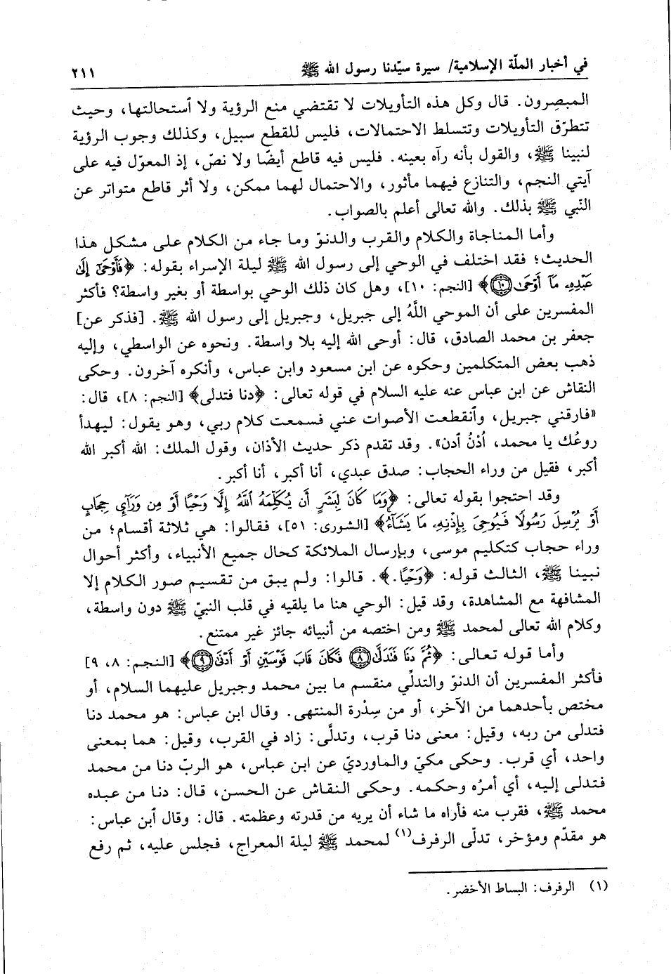 المبصرون . قال : وكل هذه التأويلات لا تقتضي منع الرؤية ولا استحالتها وحيث تتطرق التأويلات وتتسلط الاحتمالات ، فليس للقطع سبيل ، وكذلك وجوب الرؤية لنبينا ( صلى الله عليه وسلم ) ، والقول بانه رآه بعينه . فليس فيه قاطع أيضاً ولا نص ، إذ المعول فيه على آيتي النجم ، والتنازع فيهما مأثور ، والاحتمال لهما ممكن ، ولا أثر قاطع متواتر عن النبي ( صلى الله عليه وسلم ) بذلك . والله تعالى أعلم بالصواب . وأما المناجاة والكلام والقرب والدنو وما جاء من الكلام على مشكل هذا الحديث ؛ فقد اختلف في الوحي إلى رسول الله ( صلى الله عليه وسلم ) ليلة الإسراء بقوله : " فَأوْحَى إلى عَبْدِهِ مَا أوْحَى " ، وهل كان ذلك الوحي بواسطة أو بغير واسطة ؟ فأكثر المفسرين على ان الموحي الله إلى جبريل ، وجبريل إلى رسول الله ( صلى الله عليه وسلم ) . فذكر عن جعفر بن محمد الصادق ، قال : أوحى الله إليه بلا واسطة . ونحوه عن الواسطي ، وإليه ذهب بعض المتكلمين وحكوه عن ابن مسعود وابن عباس ، وانكره آخرون . وحكى النقاش عن ابن عباس عنه عيلان لسلام في قوله تعالى : " دَنَا فَتَدَلَّى " ، قال : فارقني جبريل ، وانقطعت الأصوات عني فسمعت كلام ربي ، وهو يقول : ليهدأ روعك يا محمد ، ادن ادن . وقد تقدم ذكر حديث الأذان ، وقول الملك : الله أكبر الله أكبر ، فقيل من وراء الحجاب : صدق عبدي ، انا أكبر ، انا أكبر .