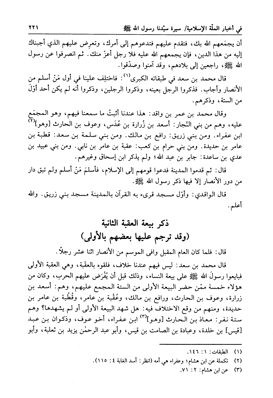 وقال محمد بن عمر بن واقد : هذا عندنا أثبت ما سمعنا فيهم ، وهو المجمع عليه ، وهم من بني النجار : أسعد بن زرارة بن عدس ، وعوف بن الحارث وهو ابن عفراء . ومن بني زريق : رافع بن مالك . ومن بني سلمة بن سعد : قطبة ابن عامر بن حديدة . ومن بني حرام بن كعب : عقبة بن عامر بن نابي . ومن بني عبيد بن عدي بن ساعدة : جابر بن عبد الله ؛ ولم يذكر ابن إسحاق غيرهم .