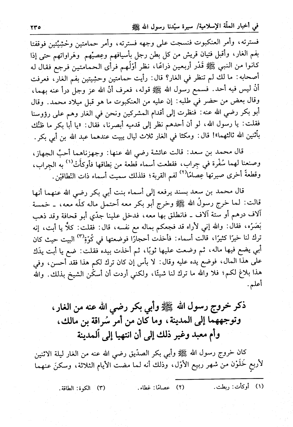 ذكر خروج رسول الله ( صلى الله عليه وسلم ) وأبي بكر رضي الله عنه من الغار ، وتوجههما إلى المدينة ، وما كان من أمر سراقة بن مالك ، وأم معبد وغير ذلك إلى ان انتهيا إلى المدينة