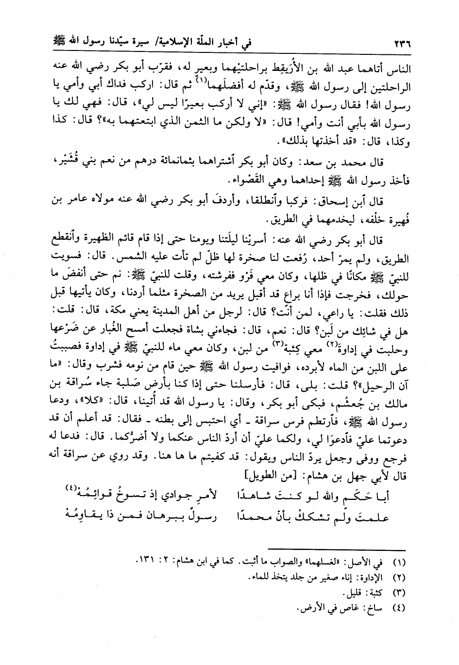 قال أبو بكر رضي الله عنه : أسرينا ليلتنا ويومنا حتى إذا قام قائم الظهيرة وانقطع الطريق ، ولم يمر أحد ، رفعت لنا صخرة لها ظل لم تأت عيلان لشمس . قال : فسويت للنبي ( صلى الله عليه وسلم ) مكاناً في ظلها وكا معي فرو ففرشته ، وقلت للنبي ( صلى الله عليه وسلم ) : نم حتى انفض ما حولك ، فخرجت فإذا انا براعٍ قد أقبل يريد من الصخرة مثلما أردنا وكا يأتيها قبل ذلك فقلت : يا راعي ، لمن انت ؟ قال : لرجل من أهل المدينة يعني مكة ، قال : قلت : هل في شائك من لبن ؟ قال : نعم ، قال : فجاءني بشاة فجعلت أمسح الغبار عن ضرعها وحلبت في إداوٍ معي كثبة من لبن ، وكا معي ماء للنبي ( صلى الله عليه وسلم ) في إداوة فصببت على اللبن من الماء لأبرده ، فوافيت رسول الله ( صلى الله عليه وسلم ) حين قام من نومه فشرب وقال : م ان االرحيل ؟ قلت : بلى ، قال : فأرسلنا حتى إذا كنا بأرض صلبة جاء سراقة بن مالك بن جعشم ، فبكى أبو بكر وقال : يا رسول الله قد أتينا قال : كلأن ودعا رسول الله ( صلى الله عليه وسلم ) ، فارتطم فرس سراقة - أي احتبس إلى بطنه - فقال : قد أعلماقد دعوتما علي فادعوا لي ، ولكما علي ان أرد الناس عنكما ولا أضركما . فدعا له فرجع ووفى وجعل يرد الناس ويقول : قد كفيتم ما ها هنا . وقد روى عن سراقة انه قال لأبي جهل بن هشام :