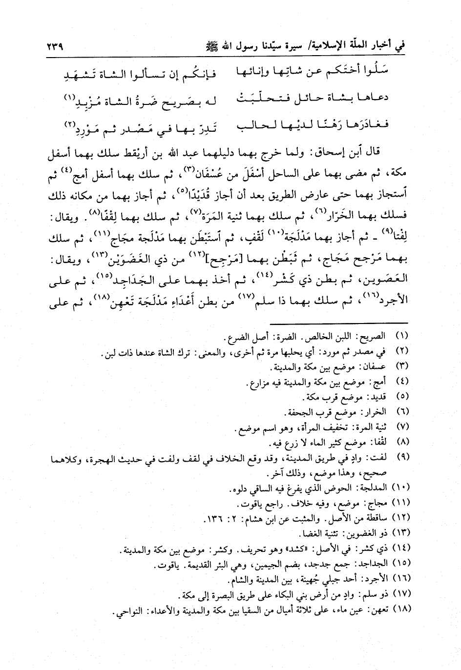 فغادرها رهنا لديها لحالب . . . تدرّ بها في مصدر ثم مورد قال ابن إسحاق : ولما خرج بهما دليلهما عبد الله بن أرقط سلك بهما أسفل مكة ، ثم مضى بهما على الساحل أسفل من عسفان ، ثم سلك بهما أسفل الحج ثم استجاز بهما حتى عارض الطريق بعد ان أجاز قديد . ثم أجاز بهما من مكانه ذلك فسلك بهما الخرار ، ثم سلك بهما ثنية المرة ، ثم سلك بهما لقفا - ويقال لفتا - ثم أجاز بهما مدلجة لقف ، ثم استبطن بهما مدلجة مجاح ، ثم سلك بهما مرجح مجاج ، ثم نبطن بهما مرجح من ذي الغضوين ، ويقال : العصو بن ، ثم بطن ذي كشر ، ثم أخذ بهما على الجداجد ، ثم على الأجرد ، ثم سلك بهما ذا سلم من بطن أعداء مدلجة تعهن ، ثم على