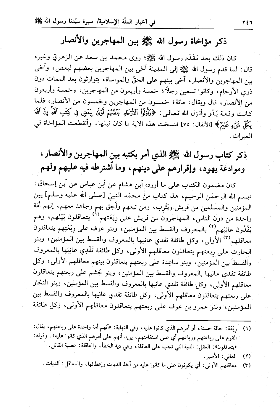 كا مضمون الكتاب على ما أورده ابن هشام عن ابن إسحاق : بسم الله الرحمن الرحيم ، هذا كتاب من محمد النبي ( صلى الله عليه وسلم ) بين المؤمنين والمسلمين من قريش ويثرب ، ومن تبعهم ولحق بهم وجاهد معهم ، انهم أمة واحدة من دون الناس ، المهاجرون من قريش على ربعتهم يتعاقلون بينهم ، وهم يفدون عانيهم بالمعروف والقسط بين المؤمنين ، وبنو عوف على ربعتهم يتعاقلون معاقلهم الأولى ، وكل طائفة