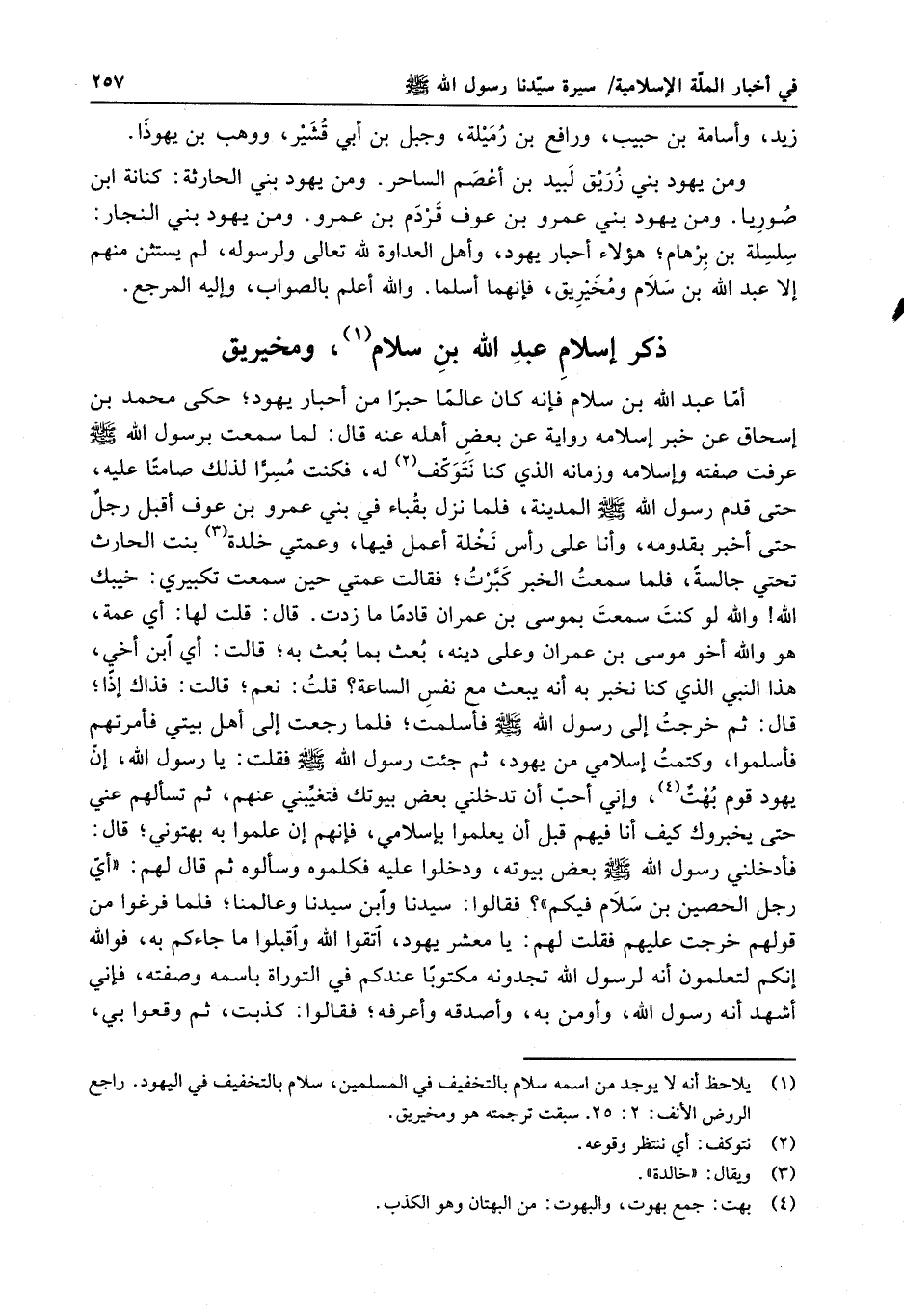 أما عبد الله بن سلام فانه كان عالماً حبراً من أحبار يهود ؛ حكى محمد بن إسحاق عن خبر إسلامه رواية عن بعض أهله عنه قال : لما سمعت برسول الله ( صلى الله عليه وسلم ) عرفت صفته وإسلامه وزمانه الذي كنا نتوكف له ، فكنت مسراً لذلك صامتا عليه ، حتى قدم رسول الله ( صلى الله عليه وسلم ) المدينة ، فلما نزل بقباء في بني عمرو بن عوف أقبل رجلٌ حتى أخبر بقدومه ، وانا على رأس نخلةٍ أعمل فيها وعمتي خلدة بنت الحارث تحتي جالسةً ، فلما سمعت الخبر كبرت ؛ فقالت عمتي حين سمعت تكبيري : خيبك الله والله لو كنت سمعت بموسى بن عمرا قادماً ما زدت . قال : قلت لها : أي عمة ، هو والله أخو موسى بن عمرا وعلى دينه ، بعث بما بعث به ؛ قالت : أي ابن أخي ، هذا النبي الذي كنا نخبر به انه يبعث مع نفس الساعة ؟ قلت نعم ؛ قالت : فذاك إذاً ؛ قال : ثم خرجت إلى رسول الله ( صلى الله عليه وسلم ) فأسلمت ؛ فلما رجعت إلى أهل بيتي فأمرتهم فأسلموا وكتمت إسلامي من يهود ، ثم جئت رسول الله ( صلى الله عليه وسلم ) فقلت : يا رسول الله ، ايهود قوم بهتٌ ، واني أحباتدخلني بعض بيوتك فتغيبني عنهم ، ثم تسألهم عني حتى يخبروك كيف انا فيهم قبلايعلموا بإسلامي ، فانهماعلموا به بهتوني ؛ قال : فأدخلني رسول الله ( صلى الله عليه وسلم ) بعض بيوته ، ودخلوا عليه فكلموه وساءلوه ثم قال لهم : أي رجل الحصين بن سلام فيكم ؟ فقالوا : سيدنا وابن سيدنا وعالمنا ؛ فلما فرغوا من قولهم خرجت عليهم فقلت لهم : يا معشر يهود ، اتقوا الله واقبلوا ما جاءكم به ، فوالله انكم لتعلمون انه لرسول الله تجدونه مكتوباً عندكم في التوراة باسمه وصفته ، فاني أشهد انه رسول الله ، وأؤمن به ، وأصدقه وأعرفه ؛ فقالوا : كذبت ، ثم وقعوا بي ،