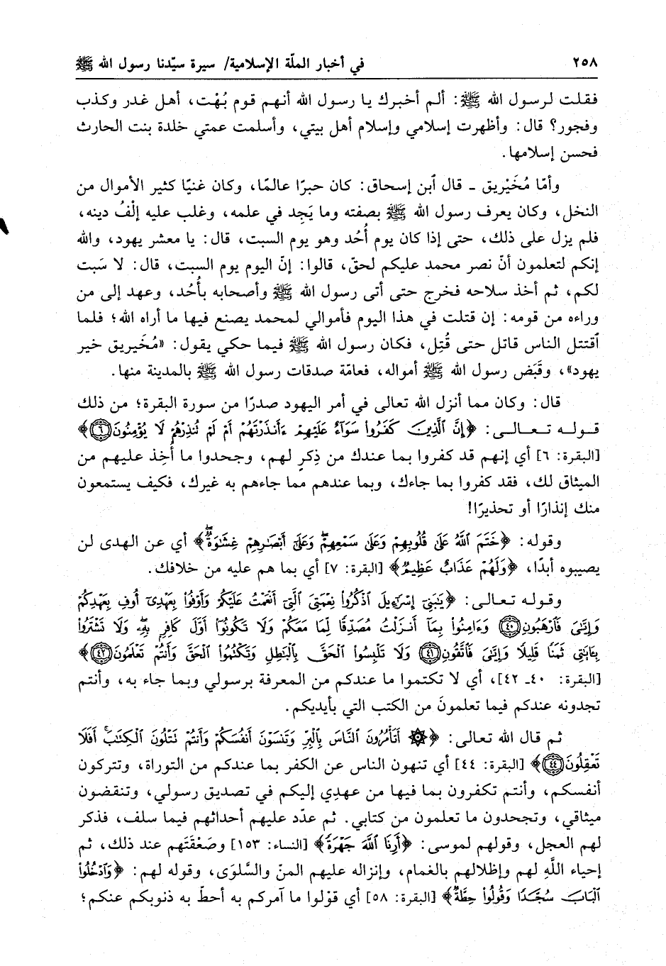 قال : وكا مما انزل الله تعالى في أمر اليهود صدرا من سورة البقرة ، من ذلك قوله تعالى : " ا الذَّيِنَ كَفَرُوا سَوَاءٌ عَلَيْهِمْ أانذَرْتَهُمْ أمْ لَمْ تُنْذِرْهُمْ لاَ يُؤْمِنُونَ " أي انهم قد كفروا بما عندك من ذكرٍ لهم ، وحجدوا ما أخذ عليهم من الميثاق لك ، فقد كفروا بما جاءك ، وبما عندهم به غيرك ، فكيف يستمعون منك انذاراً أو تحذيراً وقوله : " خَتَمَ اللهُ عَلَى قُلُوبِهِمْ وَعَلَى سَمْعِهِمْ وَعَلَى أبْصَارِهِمْ غِشَاوَةٌ " أي عن الهدى لن يصيبوه أبدا " وَلَهُمْ عَذَابٌ عَظِيمٌ " أي بما هم عليه من خلافك .