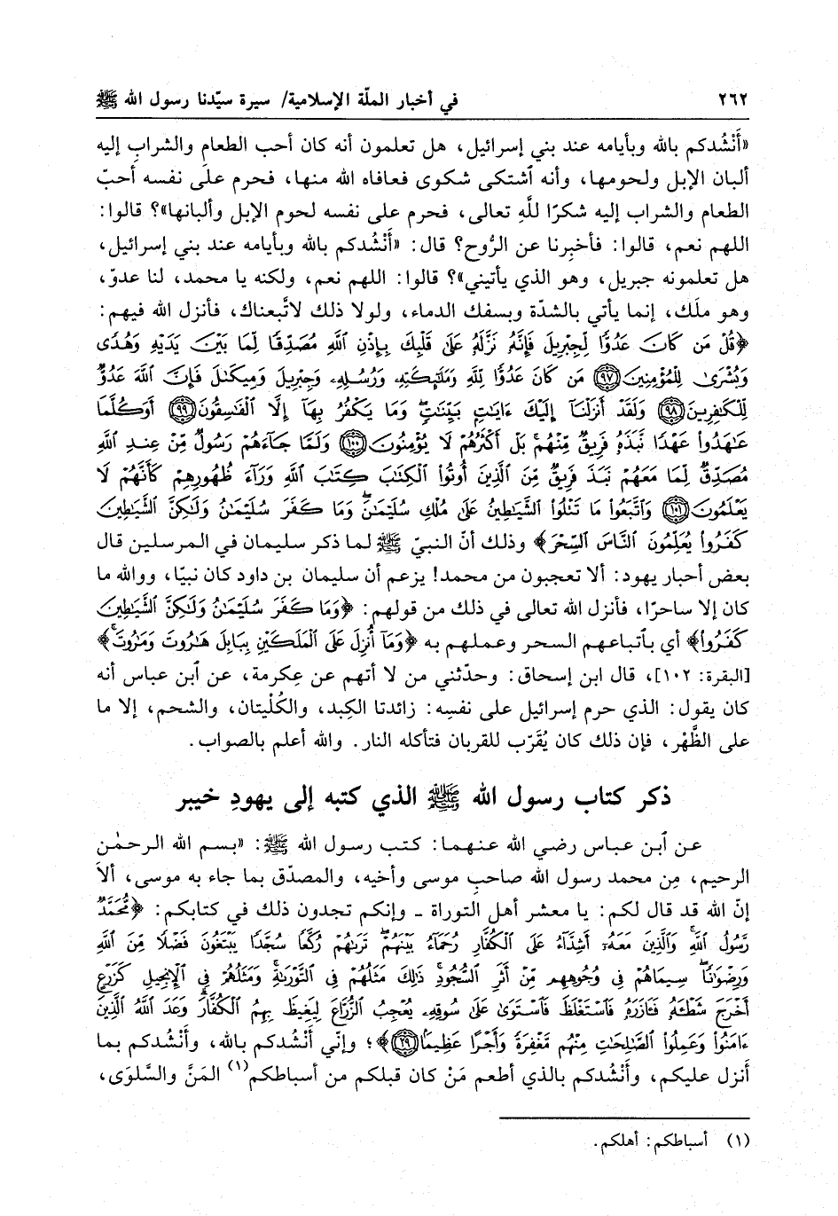 عن ابن عباس رضي الله عنهما : كتب رسول الله ( صلى الله عليه وسلم ) : بسم الله الرحمن الرحيم ، من محمد رسول الله صاحب موسى وأخيه ، المصدق بما جاء به موسى ، أل ان االله قد قال لكم : يا معشر أهل التوراة - وانكم تجدون ذلك في كتابكم : " مُحَمَّدٌ رَسُولُ اللهِ وَالَّذِينَ مَعَهُ أشِدَّاءُ عَلَى الْكُفَّارِ رُحَمَاءُ بَيْنَهُمْ تَرَاهُمْ رُكَّعاً سُجَّداً يَبْتَغُونَ فَضْلاً مِنَ اللهِ وَرِضْوَاناً سِيَماهُمْ في وُجوهِهِمْ مِنْ أثَرِ السُّجُودِ ذَلِكَ مَثَلُهُمْ في التَّوْرَاةِ وَمَثَلُهُمْ في الأنجِيلِ كَزَرْعٍ أخْرَجَ شَطْأهُ فآزَرَهُ فَأسْتَغْلَظَ فَاَسْتَوَى عَلَى سُوقِهِ يُعْجِبُ الزُّرَّاعَ لِيَغِيظَ بِهِمُ الْكُفَّارَ وَعَدَ اللهُ الَّذِينَ آمَنُوا وَعَمِلُوا الصَّالِحَاتِ مِنْهُمْ مَغْفِرَةً وَأجْراً عَظِيماً " ؛ واني انشدكم بالله ، وانشدكم بما انزل عليكم ، وانشدكم بالذي أطعم من كان قبلكم من أسباطكم المن والسلوى ،