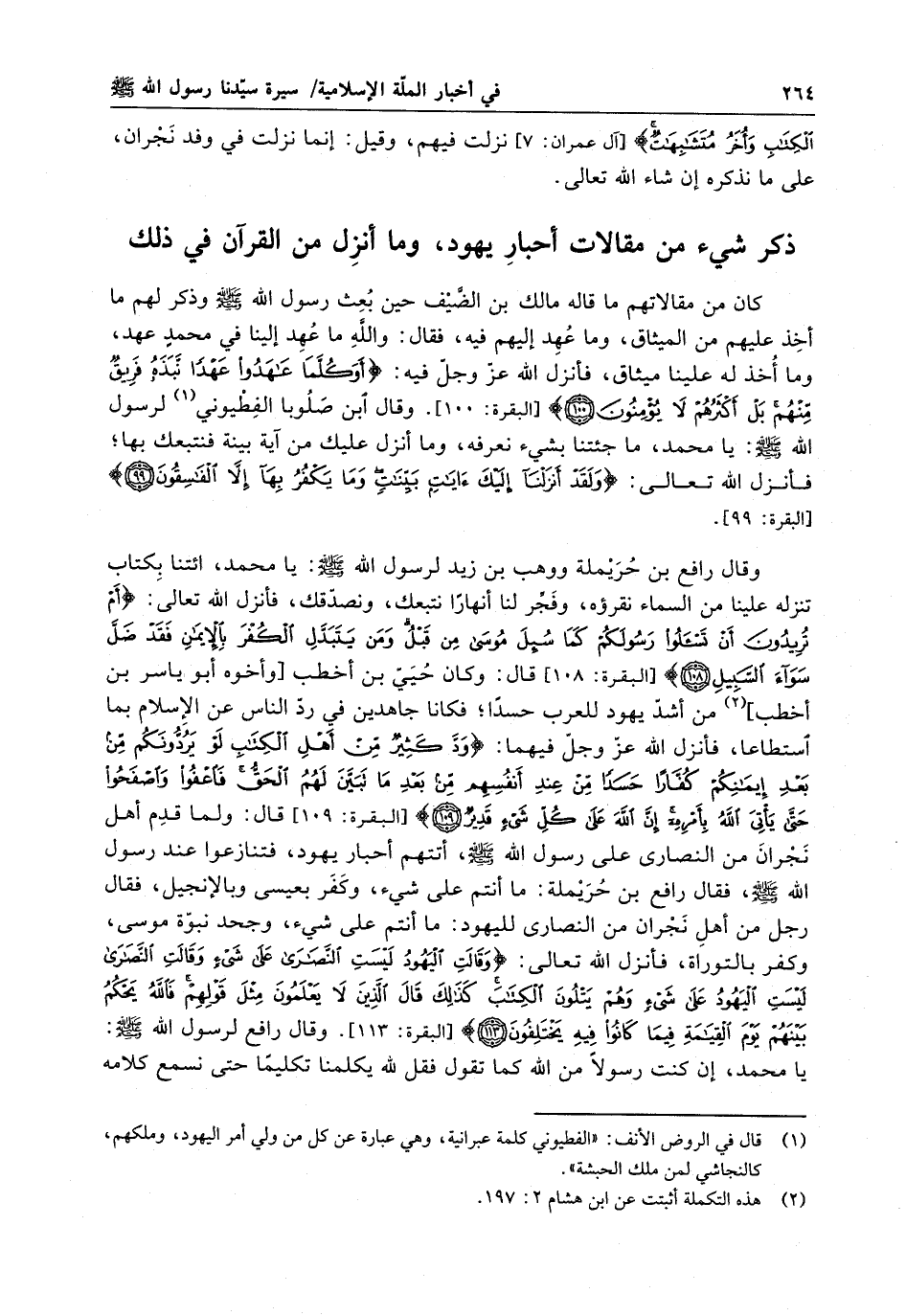 كان من مقالاتهم ما قاله مالك بن الضيف حين بعث رسول الله ( صلى الله عليه وسلم ) وذكر لهم ما أخذ عليهم من الميثاق ، وما عهد إليهم فيه ، فقال : والله ما عهد إلينا في محمدٍ عهد ، وما أخذ له علينا ميثاق ، فانزل الله عز وجل فيه : " أوَكُلَّمَا عَاهَدُوا عَهْداً نَبَذَهُ فَرِيقُ مِنْهُمْ بَلْ أكْثَرُهُمْ لاَ يُؤْمِنُونَ " . وقال ابن صلوبا الفطيوني لرسول الله ( صلى الله عليه وسلم ) : يا محمد ، ما جئتنا بشيء نعرفه ، وما انزل عليك من آية بينة فنتبعك بها ؛ فانزل الله تعالى : " وَلَقَدْ انزَلْنَا إلَيْكَ آيَاتٍ بَيِّنَاتٍ وَمَا يَكْفُرُ بِهَا إلاَّ الْفَاسِقُونَ " . وقال رافع بن حريملة ، ووهب بن زيد لرسول الله ( صلى الله عليه وسلم ) : يا محمد ، ائتنا بكتاب تنزله علينا من السماء نقرؤه ، وفجر لنا انهارا نتبعك ونصدقك ، فانزل الله تعالى : " أمْ تُرِيدُونَاتَسْألُوا رَسُولَكُمْ كَمَا سُئِلَ مُوسَى مِنْ قَبْلُ وَمَنْ يَتَبَدَّلِ الْكُفْرَ بِالإْيما فَقَدْ ضَلَّ سَوَاءَ السَّبِيِل " قال : وكا حي بن أخطب وأخوه أبو ياسر بن أخطب من أشد يهود للعرب حسدا ؛ فكانا جاهدين في رد الناس عن الإسلام بما استطاعا فانزل الله عز وجل فيهما : " وَدَّ كَثِيرٌ مِنْ أهْلِ الْكتَابِ لَوْ يَرُدُّونَكُمْ مِنْ بَعْدِ إيَمانكُمْ كُفَّاراً حَسَداً مِنْ عِنْدِ انفُسِهِمْ مِنْ بَعْدِ مَا تَبَيَّنَ لَهُمُ الْحَقُّ فَاعْفُوا وَاصْفَحُوا حَتَّى يَأتيَ اللهُ بِأمْرِه ان اللهَ عَلَى كُلِّ شَيْءٍ قَدِيرٌ " قال : ولما قدم أهل نجرا من النصارى على رسول الله ( صلى الله عليه وسلم ) ، أتتهم أحبار يهود ، فتنازعوا عند رسول الله ( صلى الله عليه وسلم ) ، فقال رافع بن حريملة : ما أنتم على شيء ، وكفر بعيسى وبالأنجيل ، فقال رجل من أهل نجرا من النصارى لليهود : ما أنتم على شيء ، وجحد نبوة موسى ، وكفر بالتوراة ، فانزل الله تعالى : " وَقَالتِ الْيَهُودُ لَيْسَتِ النَّصَارَى عَلَى شَيْءٍ وَقَالتِ النَّصَارَى لَيْسَتِ الْيَهُودُ عَلَى شَيْءٍ وَهُمْ يَتْلُونَ الْكتَابَ كَذَلِكَ قَالَ الَّذِينَ لاَ يَعْلَمُونَ مِثْلَ قَوْلِهْم فَاللهُ يَحْكُمُ بَيْنَهُمْ يَوْمَ الْقِيَامَةِ فِيَما كَانوا فِيهِ يَخْتَلِفُونَ " . وقال رافع لرسول الله ( صلى الله عليه وسلم ) : يا محمد ، اكنت رسولا من الله كما تقول فقل لله يكلمنا تكليما حتى نسمع كلامه ،