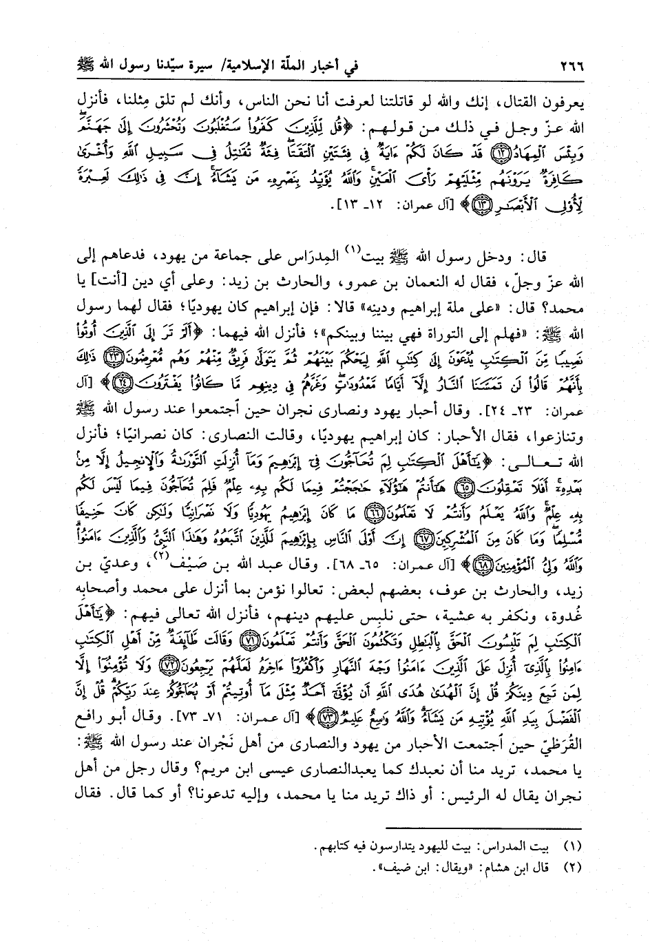 يعرفون القتال ، انك والله لو قاتلتنا لعرفت انا نحن الناس ، وانك لم تلق مثلها فانزل الله عز وجل في ذلك من قولهم : " قُلْ لِلَّذِينَ كَفَرُوا سَتُغْلَبُونَ وَتُحْشَرُونَ إلَى جَهَنَّمَ وبِئْسَ الْمِهَادُ . قَدْ كان لَكُمْ آيَةٌ في فِئَتَيْنِ التَقَيَتا فِئَةٌ تُقَاتِلُ في سَبِيل الله وَأخْرَى كَافِرَةٌ يَرَوْنَهُم مِثْلَيْهِمْ رَأىَ الْعَيْنِ وَاللهُ يُؤيِّدُ بنَصْرِهِ مَنْ يَشَاءُافي ذَلِكَ لَعِبْرَةً لأُولي الأبْصَار " . قال : ودخل رسول الله ( صلى الله عليه وسلم ) بيت المدارس على جماعة من يهود ، فدعاهم إلى الله عز وجل ، فقال له النعما بن عمرو ، والحارث بن زيد : وعلى اي دين انت يا محمد ؟ قال : على ملة إبراهيم ودينه قالا : فا إبراهيم كان يهوديا ؛ فقال لهما رسول الله ( صلى الله عليه وسلم ) : فهلم إلى النوارة فهي بيننا وبينكم ؛ فانزل الله فيهما : " ألَمْ تَرَ إلَى الَّذِينَ أُوتُوا نَصِيباً مِن الْكتَابِ يُدْعَوْنَ إلَى كِتَابِ اللهِ لِيَحْكُمَ بَيْنَهُمْ ثُمَّ يَتَوَلَّى فَرِيقٌ مِنْهُمْ وَهُمْ مُعْرِضُونَ . ذَلِكَ بانهُمْ قَالُوا لَنْ تَمَسَّنَا النَّارُ إلاَّ أيَّاماً مَعْدُودَاتٍ وَغَرَّهُمْ في دِينهِمْ مَا كَانوا يَفْتَرُونَ " . وقال أحبار يهود ونصارى نجرا حين اجتمعوا عند رسول الله ( صلى الله عليه وسلم ) وتنازعوا فقال الأحبار : كان إبراهيم يهوديا وقالت النصارى : كان نصرانيا ؛ فانزل الله تعالى : " يَأهْلَ الْكِتَابِ لِمَ تُحَاجُّونَ في إبْرَاهِيمَ وَمَا انزِلَتِ التَّوْرَاةُ وَالأنجِيلُ إلاَّ مِنْ بَعْدِهِ أفَلاَ تَعْقِلُونَ . هانتُمْ هَؤُلاَءِ حَاجَجْتُمْ فِيَما لَكُمْ بِهِ عِلْمٌ فَلِمَ تُحَاجُّونَ فِيَما لَيْسَ لَكُمْ بِهِ عِلْمٌ وَاللهُ يَعْلَمُ وَانتُمْ لاَ تَعْلَمُونَ . مَا كان إبْرَاهِيمُ يَهُودِيّاً وَلاَ نْصَرانيّاً وَلَكِنْ كان حَنِيفاً مُسْلِماً وَمَا كان مِنَ الْمُشِرِكينَ . ان أوْلَى النَّاسِ بِإبْرَاهِيمَ لَلَّذِينَ اتَّبَعُوهُ وَهّذَا النَّبِيُّ وَالَّذِينَ آمَنُوا وَاللهُ وَليُّ الْمُؤْمِنِينَ " . وقال عبد الله بن صيف ، وعدي بن زيد ، والحارث بن عوف ، بعضهم لبعض : تعالوا نؤمن بما انزل على محمد وأصحابه غدوة ، ونكفر به عشية ، حتى نلبس عليهم دينهم ، فانزل الله تعالى فيهم : " يَأهْلَ الْكتَابِ لِمَ تَلْبِسُونَ الْحَقَّ بِالْبَاطِلِ وَتَكْتُمُونَ الْحَقَّ وَانتُمْ تَعْلَمُونَ . وقَالَتْ طَائِفَةٌ مِنْ أهْلِ الكِتَابِ آمِنُوا بِالَّذِي انزِلَ عَلَى الَّذِينَ آمَنُوا وَجْهَ النَّهَارِ وَاكْفُرُوا آخرَهُ لَعَلَّهُمْ يَرْجِعُونَ . وَلاَ تُؤْمِنُوا إلاَّ لِمَنْ تَبِعَ دِينَكُمْ قُلْ ان الْهُدَى هُدَى اللهِايُؤْتَى أحَدٌ مِثْلَ مَا أُوتِيتُمْ أوْ يُحَاجُّوكُمْ عِنْدَ رَبِّكُمْ قُلْ ان الْفَضْلَ بِيَدِ اللهِ يُؤْتيهِ مَنْ يَشَاءُ وَاللهُ وَاسِعٌ عَليمٌ " . وقال أبو رافع القرظي حين اجتمعت الأحبار من يهود والنصارى من أهل نجرا عند رسول الله ( صلى الله عليه وسلم ) : يا محمد ، تريد من ان انعبدك كما يعبد النصارى عيسى بن مريم ؟ وقال رجل من أهل نجرا يقال له الرئيس : أو ذاك تريد منا يا محمد ، وإليه تدعونا ؟ أو كما قال . فقال