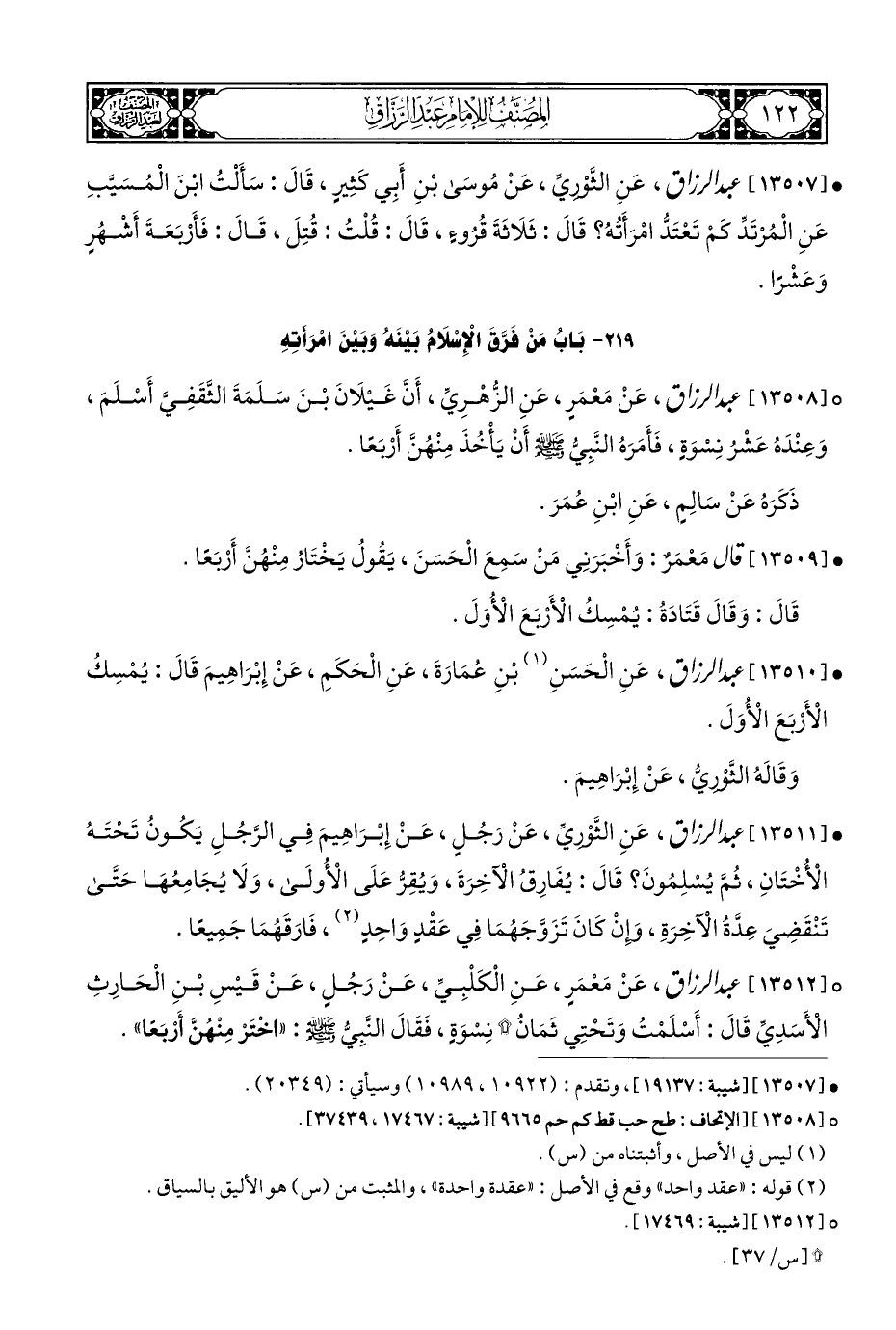 ° [١٣٥٠٨] عبد الرزاق، عَنْ مَعْمَر، عَنِ الزُّهْرِيِّ، أَنَّ غَيْلَانَ بْنَ سَلَمَةَ الثَّقَفِيَّ أَسْلَمَ، وَعِنْدهُ عَشْرُ نِشْوَةٍ، فَأَمَرَهُ النَّبِي - صلى الله عليه وسلم - أَنْ يَأْخُذَ مِنْهُن أَرْبَعًا.