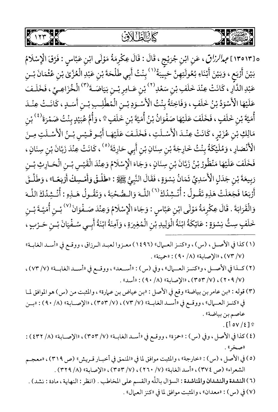 ° [١٣٥١٣] عبد الرزاق، عَنِ ابْنِ جُرَيْجٍ، قَالَ: قَالَ عِكْرِمَةُ مَوْلَى ابْنِ عَبَّاسٍ: فَرَّقَ الْإِسْلَامُ بَيْنَ أَرْبَعٍ، وَبَيْنَ أَبْنَاءِ بُعُولَتِهِنَّ حَبِيبَةُ (¬١) بِنْتُ أَبِي طَلْحَةَ بْنِ عَبْدِ الْعُزَّي بْنِ عُثْمَانَ بْنِ عَبْدِ الدَّارِ، كَانَتْ عِنْدَ خَلَفِ بْنِ سَعْدِ (¬٢) بْنِ عَامِرِ بْنِ بَيَاضَةَ (¬٣) الْخُزَاعِي، فَخَلَفَ عَلَيْهَا الْأَسْوَدُ بْنُ خَلَفٍ، وَفَاخِتَةُ بِنْتُ الْأَسْوَدِ بْنِ الْمُطَّلِبِ بْنِ أَسَدٍ، كَانَتْ عِنْدَ أُمَيَّةَ بْنِ خَلَفٍ، فَخَلَفَ عَلَيْهَا صَفْوَانُ بْنُ أُمَيَّةَ بْنِ خَلَف*، وَأُمُّ عُبَيْدٍ بِنْتُ ضَمْرَةَ (¬٤) بْنِ مَالِكِ بْنِ عُزَيْرٍ، كَانَتْ عِنْدَ الْأَسْلَتِ، فَخَلَفَ عَلَيْهَا أَبُو قَيْسِ بْنُ الْأَسْلَتِ مِنَ الْأَنْصَارِ، وَمُلَيْكَةُ بِنْتُ خَارِجَةَ بْنِ سِنَانِ بْنِ أَبِي حَارِثَةَ (¬٥)، كَانَتْ عِنْدَ زَيَّانَ بْنِ سِنَانٍ، فَخَلَفَ عَلَيْهَا مَنْظُورُ بْنُ زَبَّانَ بْنِ سِنَانٍ، وَجَاءَ الْإِسْلَامُ وَعِنْدَ الْقَيْسِ بْنِ الْحَارِثِ بْنِ رَبِيعَةَ بْنِ جَدَلٍ الْأَسَدِيِّ ثَمَانُ نِشْوَةٍ، فَقَالَ النَّبِيُّ - صلى الله عليه وسلم -: "طَلِّقْ وَأَمْسِكْ أَرْبعًا"، وَطَلَّقَ أَرْبَعًا فَجَعَلَتْ هَذِهِ تَقُولُ: أُنْشِدُكَ (¬٦) اللَّهَ وَالصُّحْبَةَ، وَتَقُولُ هَذِهِ: أُنْشِدُكَ الله وَالْقَرَابَةَ. قَالَ عِكْرِمَةُ مَوْلَى ابْنِ عَبَّاسٍ: وَجَاءَ الْإِسْلَامُ وَعِنْدَ صَفْوَانَ (¬٧) بْنِ أُمَيَّةَ بْنِ خَلَفٍ سِتُّ نِسْوَةٍ: عَاتِكَةُ ابْنَةُ الْوَلِيدِ بْنِ الْمُغِيرَةِ، وَآمِنَةُ ابْنَةُ أَبِي سُفْيَانَ بْنِ حَربٍ،