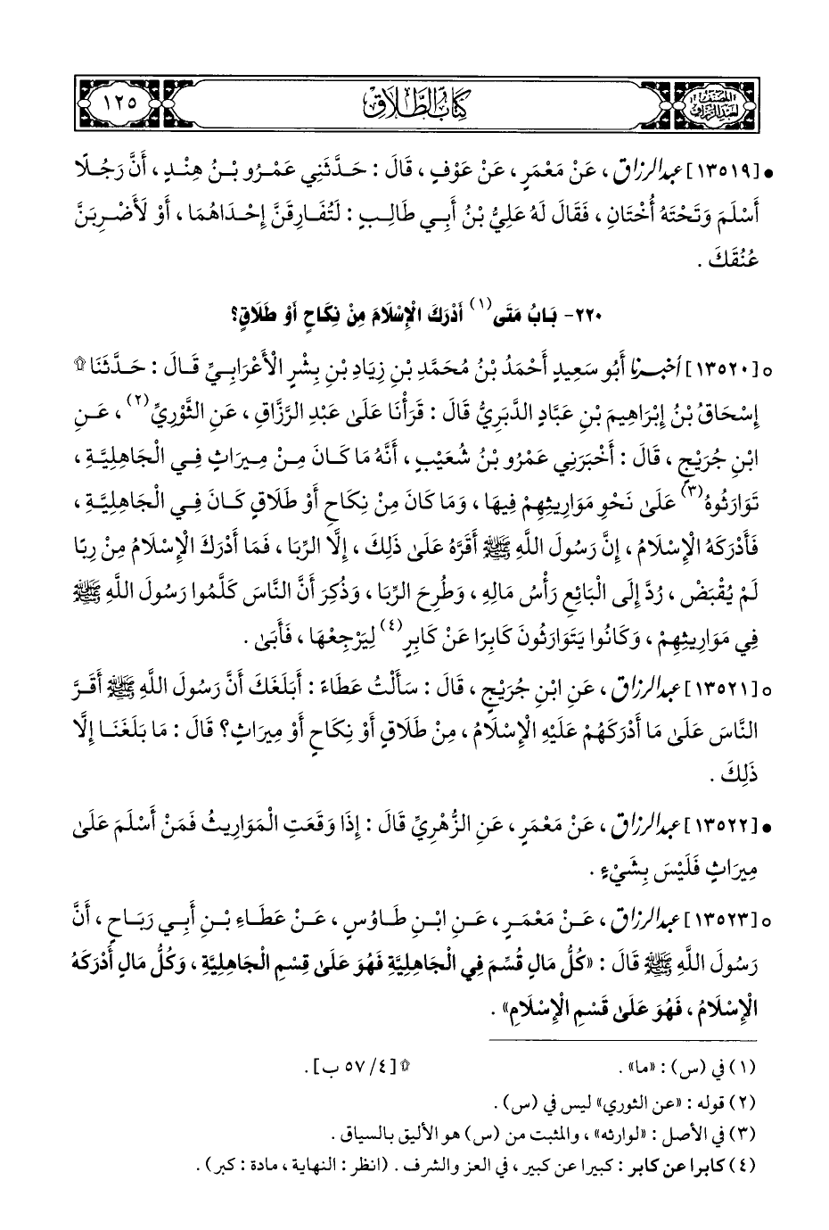 ° [١٣٥٢٠] أخبرنا أَبُو سَعِيدٍ أَحْمَدُ بْنُ مُحَمَّدِ بْنِ زِيَادِ بْنِ بِشْرٍ الْأَعْرَابِي قَالَ: حَدَّثَنَا* إِسْحَاقُ بْنُ إِبْرَاهِيمَ بْنِ عَبَّادٍ الدَّبَرِيُّ قَالَ: قَرَأْنَا عَلَى عَبْدِ الرَّزَّاقِ، عَنِ الثَّوْرِيِّ (¬٢)، عَنِ ابْنِ جُرَيْجٍ، قَالَ: أَخْبَرَنِي عَمْرُو بْنُ شُعَيْبٍ، أَنَّهُ مَا كَانَ مِنْ مِيرَاثِ فِي الْجَاهِلِيَّةِ، تَوَارَثُوهُ (¬٣) عَلَى نَحْوِ مَوَارِيثِهِمْ فِيهَا، وَمَا كَانَ مِنْ نِكَاحٍ أَوْ طَلَاقٍ كَانَ فِي الْجَاهِلِيَّةِ، فَأَدْرَكَهُ الْإِسْلَامُ، إِنَّ رَسُولَ الله - صلى الله عليه وسلم - أَقَرَّهُ عَلَى ذَلِكَ، إِلَّا الرِّبَا، فَمَا أَدْرَكَ الْإِسْلَامُ مِنْ رِبًا لَمْ يُقْبَضْ، رُدَّ إِلَى الْبَائِعِ رَأْسُ مَالِهِ، وَطُرِحَ الرِّبَا، وَذُكِرَ أَنَّ النَّاسَ كَلَّمُوا رَسُولَ اللهِ - صلى الله عليه وسلم - فِي مَوَارِيثِهِمْ، وَكَانُوا يَتَوَارَثُونَ كَابرًا عَنْ كَابِرٍ (¬٤) لِيَرْجِعْهَا، فَأَبَى.