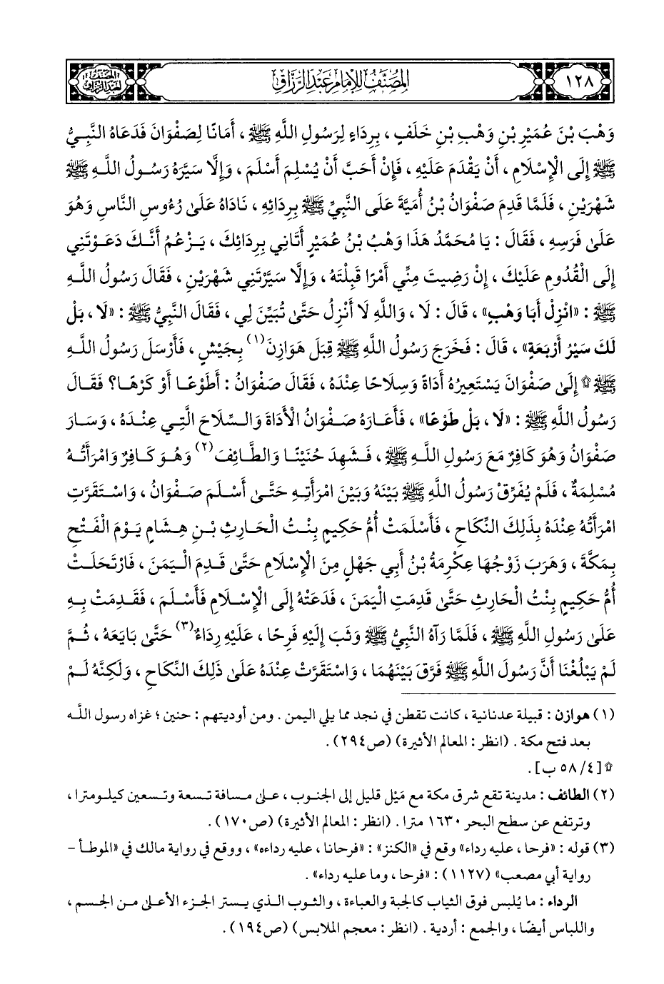 وَهْبَ بْنَ عُمَيْرِ بْنِ وَهْبِ بْنِ خَلَفٍ، بِرِدَاءٍ لِرَسُولِ اللَّهِ - صلى الله عليه وسلم -، أَمَانًا لِصَفْوَانَ فَدَعَاهُ النَّبِيُّ - صلى الله عليه وسلم - إِلَى الْإِسْلَامِ، أَنْ يَقْدَمَ عَلَيْهِ، فَإِنْ أَحَبَّ أَنْ يُسْلِمَ أَسْلَمَ، وإلَّا سَيَّرَهُ رَسُولُ اللهِ - صلى الله عليه وسلم - شَهْرَيْنِ، فَلَمَّا قَدِمَ صَفْوَانُ بْنُ أُمَيَّةَ عَلَى النَّبِيِّ - صلى الله عليه وسلم - برِدَائِهِ، نَادَاهُ عَلَى رُءُوسِ النَّاسِ وَهُوَ عَلَى فَرَسِهِ، فَقَالَ: يَا مُحَمَّدُ هَذَا وَهْبُ بْنُ عُمَيْرٍ أَتَانِي بِرِدَائِكَ، يَزْعُمُ أَنَّكَ دَعَوْتَنِي إِلَى الْقُدُومِ عَلَيْكَ، إِنْ رَضِيتَ مِنِّي أَمْرًا قَبِلْتَهُ، وإِلَّا سَيَّرتَنِي شَهْرَيْنِ، فَقَالَ رَسُولُ اللَّهِ - صلى الله عليه وسلم -: "انْزِلْ أَبَا وَهْبٍ"، قَالَ: لَا، وَاللَّهِ لَا أَنْزِلُ حَتَّى تُبَيِّنَ لِي، فَقَالَ النَّبِيُّ - صلى الله عليه وسلم -: "لَا، بَلْ لَكَ سَيْرُ أَرْبَعَةٍ"، قَالَ: فَخَرَجَ رَسُولُ اللَّهِ - صلى الله عليه وسلم - قبَلَ هَوَازِنَ (¬١) بِجَيْشٍ، فَأَرْسَلَ رَسُولُ اللَّهِ - صلى الله عليه وسلم - * إِلَى صَفْوَانَ يَسْتَعِيرُهُ أَدَاةً وَسِلَاحًا عِنْدهُ، فَقَالَ صَفْوَانُ: أَطَوْعًا أَوْ كَرْهًا؟ فَقَالَ رَسُولُ اللهِ - صلى الله عليه وسلم -: "لَا، بَلْ طَوْعًا"، فَأَعَارَهُ صفْوَانُ الْأَدَاةَ وَالسِّلَاحَ الَّتِي عِنْدَهُ، وَسَارَ صَفْوَانُ وَهُوَ كَافِرٌ مَعَ رَسُولِ اللَّهِ - صلى الله عليه وسلم -، فَشَهِدَ حُنَيْنًا وَالطَّائِفَ (¬٢) وَهُوَ كَافِرٌ وَامْرَأَتُهُ مُسْلِمَةٌ، فَلَمْ يُفَرِّقْ رَسُولُ اللَّهِ - صلى الله عليه وسلم - بينَهُ وَبَينَ امْرَأَتِهِ حَتَّى أَسْلَمَ صَفْوَانُ، وَاسْتَقَرَّتِ امْرَأَتُهُ عِنْدَهُ بِذَلِكَ النِّكَاحِ، فَأَسْلَمَتْ أُمُّ حَكِيمٍ بِنْتُ الْحَارِثِ بْنِ هِشَامٍ يَوْمَ الْفَتْحِ بِمَكَّةَ، وَهَرَبَ زَوْجُهَا عِكْرِمَةُ بْنُ أَبِي جَهْلٍ مِنَ الْإِسْلَامِ حَتَّى قَدِمَ الْيَمَنَ، فَارْتَحَلَتْ أُمُّ حَكِيمِ بِنْتُ الْحَارِثِ حَتَّى قَدِمَتِ الْيَمَنَ، فَدَعَتْهُ إِلَى الْإِسْلَامِ فَأَسْلَمَ، فَقَدِمَتْ بِهِ عَلَى رَسُولِ اللَّهِ - صلى الله عليه وسلم -، فَلَمَّا رَآهُ النَّبِيُّ - صلى الله عليه وسلم - وَثَبَ إِلَيْهِ فَرِحًا، عَلَيْهِ رِدَاءٌ (¬٣) حَتَّى بَايَعَهُ، ثُمَّ لَمْ يَبْلُغْنَا أَنَّ رَسُولَ اللَّهِ - صلى الله عليه وسلم - فَرَّقَ بَيْنَهُمَا، وَاسْتَقَرَّتْ عَنْدَهُ عَلَى ذَلِكَ النِّكَاحِ، وَلكِنَّهُ لَمْ