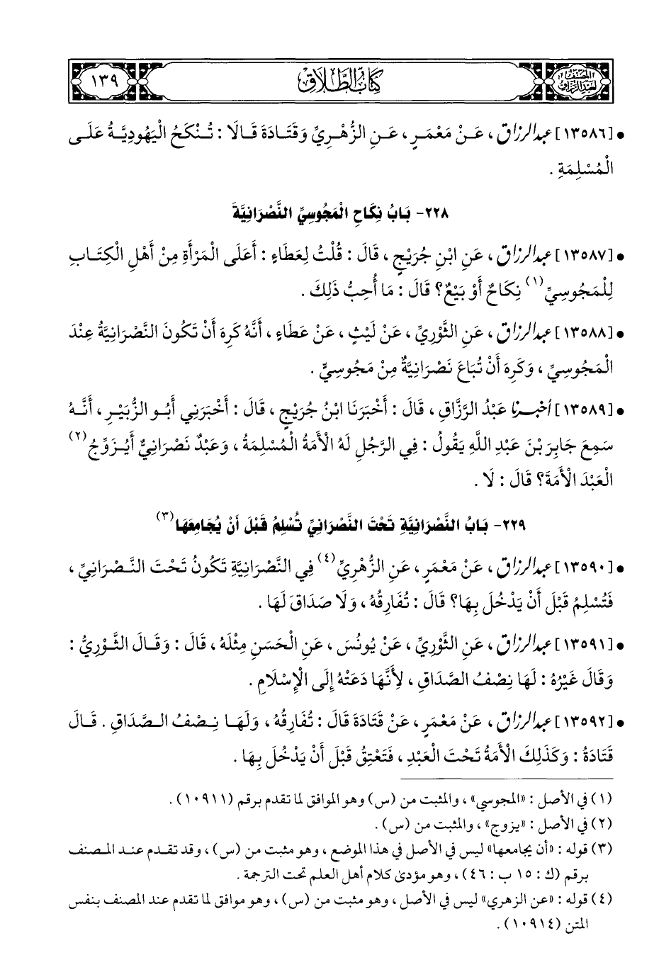 • [١٣٥٩٠] عبد الرزاق عَنْ مَعْمَرٍ، عَنِ الزُّهْرِي (¬٤) فِي النَّصْرَانِيَّةِ تَكُونُ تَحْتَ النَّصْرَانِي، فَتُسْلِمُ قَبْلَ أَنْ يَدْخُلَ بِهَا؟ قَالَ: تُفَارِقُهُ، وَلَا صَدَاقَ لَهَا.